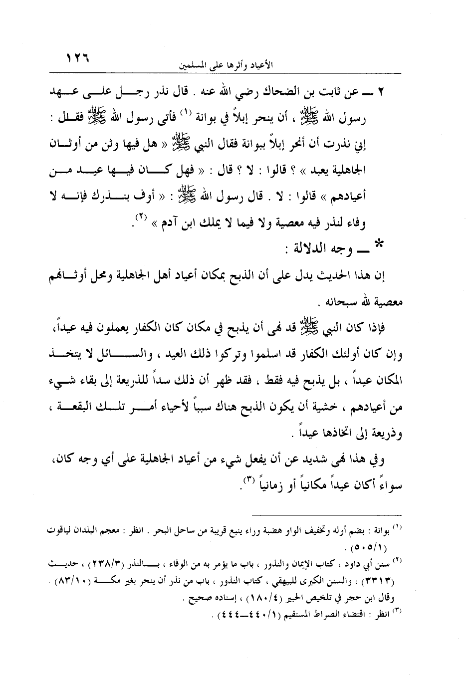 2 ـ عن ثابت بن الضحاك رضي الله عنه. قال نذر رجل على عهد رسول الله صلى الله عليه وسلم، أن ينحر إبلاً في بوانة 1 فأتى رسول الله صلى الله عليه وسلم فقال: إني نذرت أن أنحر إبلاً ببوانة فقال النبي صلى الله عليه وسلم "هل فيها وثن من أوثان الجاهلية يعبد؟ " قالوا: لا؟ قال: "فهل كان فيها عيد من أعيادهم"قالوا: لا. قال رسول الله صلى الله عليه وسلم: "أوف بنذرك فإنه لا وفاء لنذر فيه معصية ولا فيما لا يملك ابن آدم" 2.