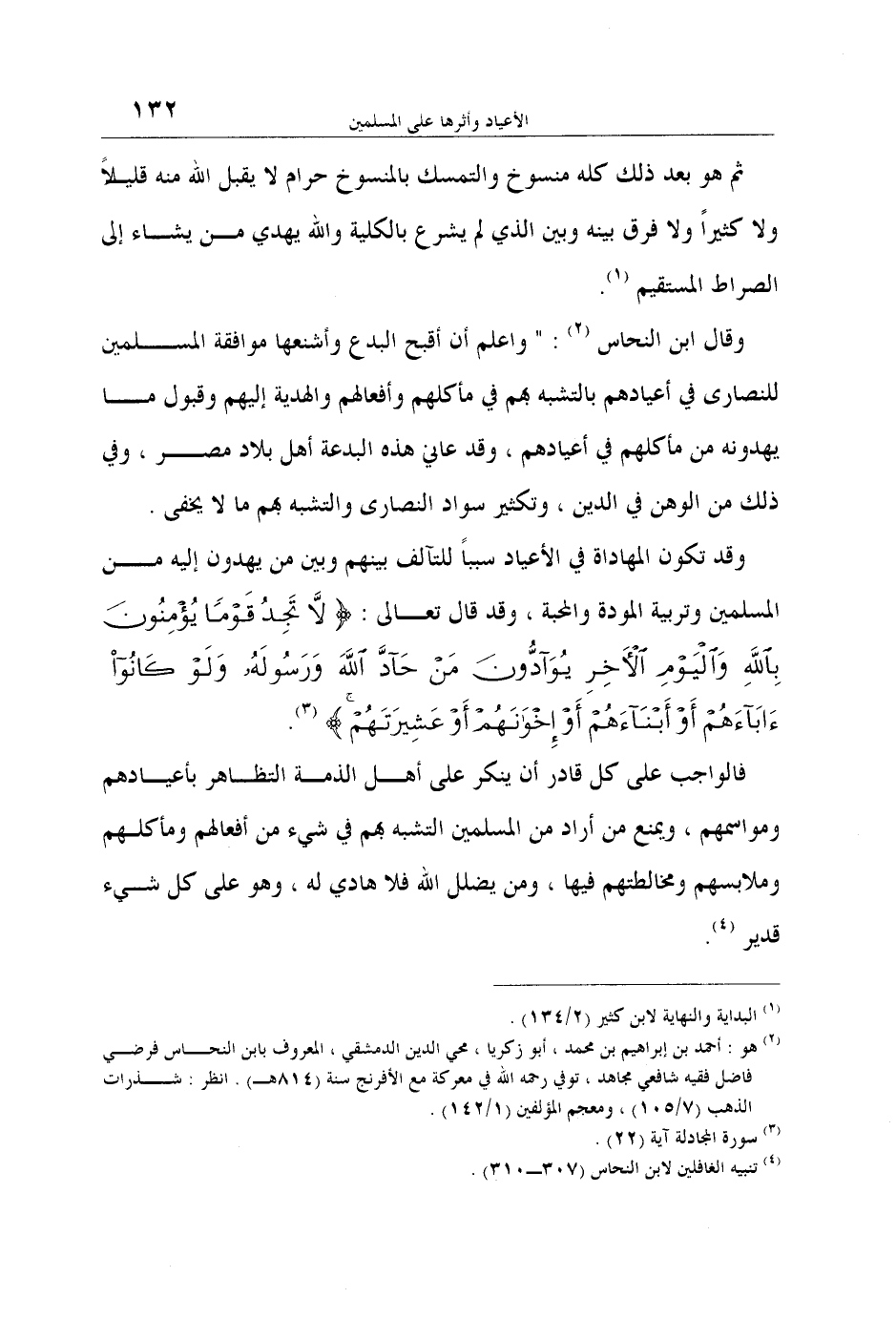 وقال ابن النحاس 2: " واعلم أن أقبح البدع وأشنعها موافقة المسلمين للنصارى في أعيادهم بالتشبه بهم في مأكلهم وأفعالهم والهدية إليهم وقبول ما يهدونه من مأكلهم في أعيادهم، وقد عاني هذه البدعة أهل بلاد مصر، وفي ذلك من الوهن في الدين، وتكثير سواد النصارى والتشبه بهم ما لا يخفى.