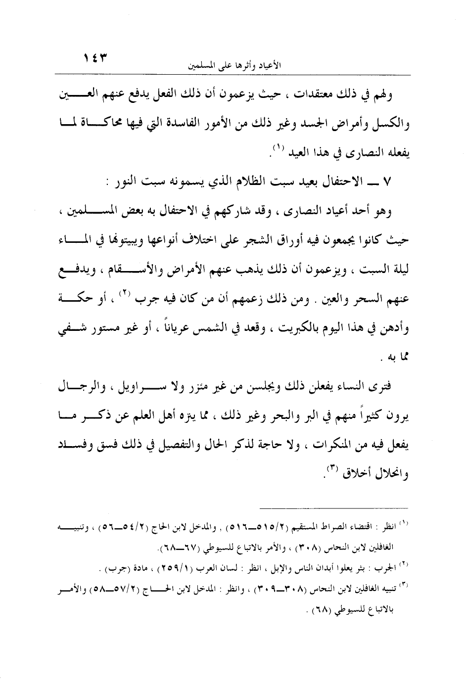 1 انظر: اقتضاء الصراط المستقيم (2/515ـ516) , والمدخل لابن الحاج (2/54ـ56) ، وتنبيه الغافلين لابن النحاس (308) ، والأمر بالاتباع للسيوطي (67ـ68) .