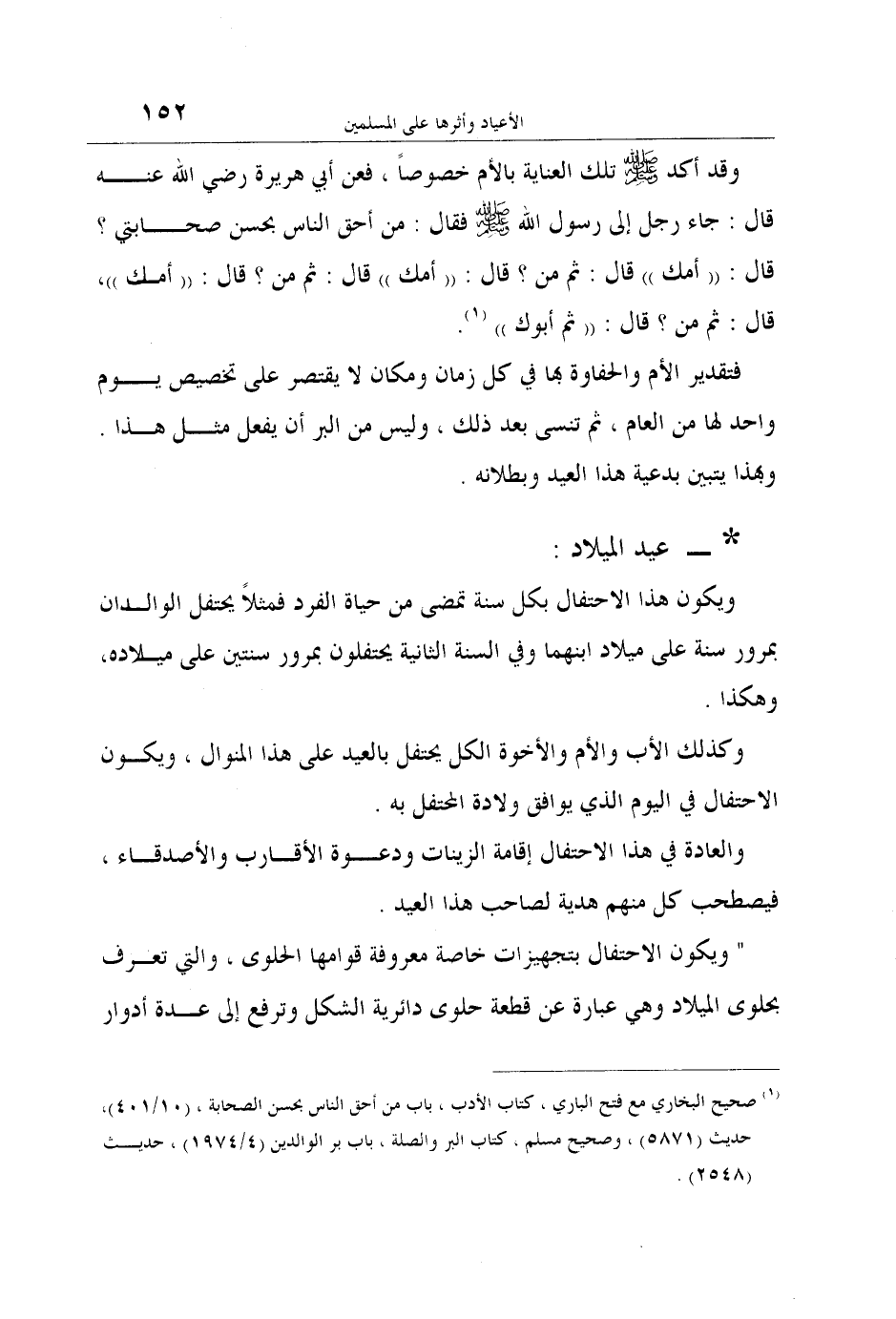 وقد أكد صلى الله عليه وسلم تلك العناية بالأم خصوصاً، فعن أبي هريرة رضي الله عنه قال: جاء رجل إلى رسول الله صلى الله عليه وسلم فقال: من أحق الناس بحسن صحابتي؟ قال: "أمك" قال: ثم من؟ قال: "أمك" قال: ثم من؟ قال: "أمك"، قال: ثم من؟ قال: "ثم أبوك" 1.