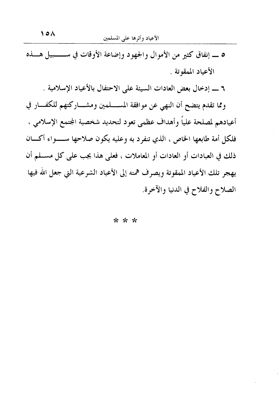 ومما تقدم يتضح أن النهي عن موافقة المسلمين ومشاركتهم للكفار في أعيادهم لمصلحة علياً وأهداف عظمى تعود لتحديد شخصية المجتمع الإسلامي، فلكل أمة طابعها الخاص، الذي تنفرد به وعليه يكون صلاحها سواء أكان ذلك في العبادات أو العادات أو المعاملات، فعلى هذا يجب على كل مسلم أن يهجر تلك الأعياد الممقوتة ويصرف همته إلى الأعياد الشرعية التي جعل الله فيها الصلاح والفلاح في الدنيا والآخرة.