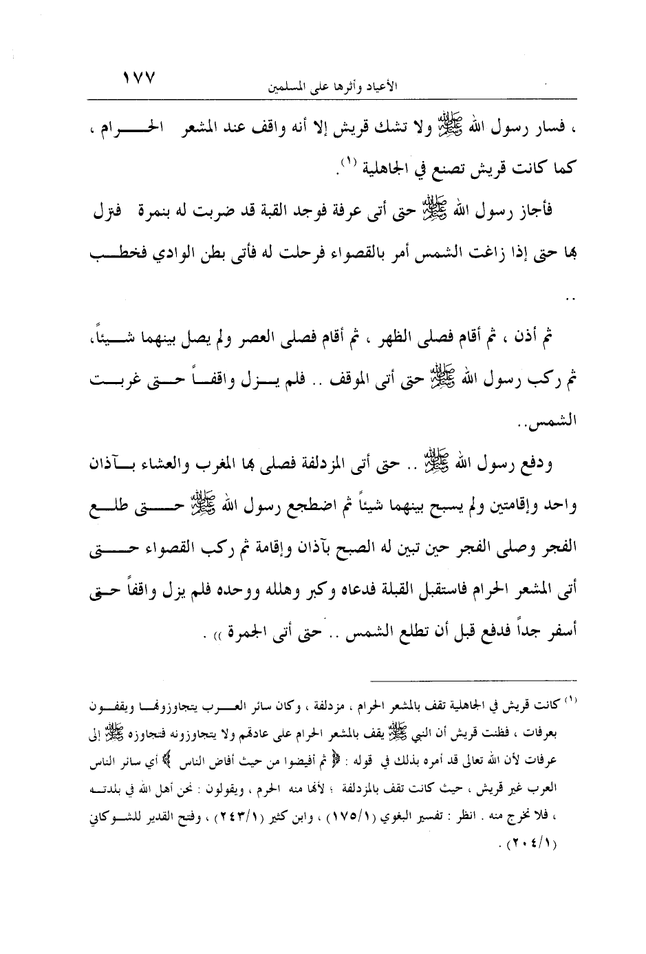 1 كانت قريش في الجاهلية تقف بالمشعر الحرام، مزدلفة، وكان سائر العرب يتجاوزونها ويقفون بعرفات، فظنت قريش أن النبي صلى الله عليه وسلم يقف بالمشعر الحرام على عادتهم ولا يتجاوزونه فتجاوزه صلى الله عليه وسلم إلى عرفات لأن الله تعالى قد أمره بذلك في قوله: {ثُمَّ أَفِيضُوا مِنْ حَيْثُ أَفَاضَ النَّاسُ} أي سائر الناس العرب غير قريش، حيث كانت تقف بالمزدلفة؛ لأنها منه الحرم، ويقولون: نحن أهل الله في بلدته، فلا نخرج منه. انظر: تفسير البغوي (1/175) ، وابن كثير (1/243) ، وفتح القدير للشوكاني (1/204) .