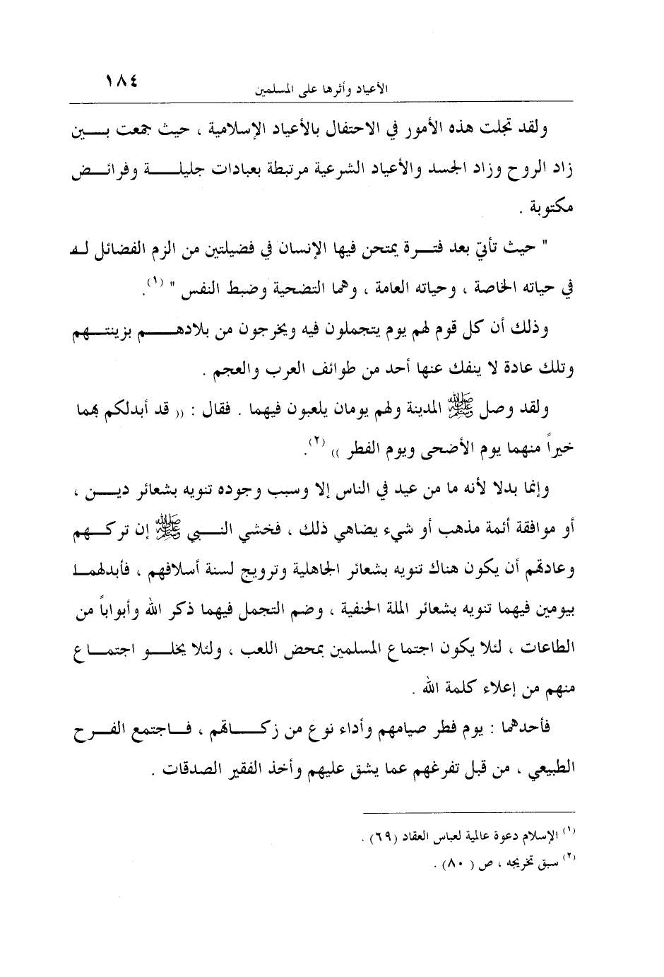 ولقد تجلت هذه الأمور في الاحتفال بالأعياد الإسلامية، حيث جمعت بين زاد الروح وزاد الجسد والأعياد الشرعية مرتبطة بعبادات جليلة وفرائض مكتوبة.