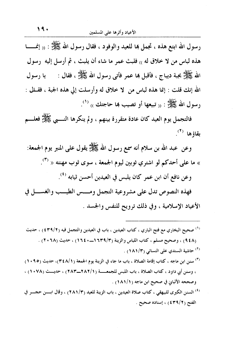 فهذه النصوص تدل على مشروعية التجمل ومس الطيب والغسل في الأعياد الإسلامية، وفي ذلك ترويح للنفس والجسد.