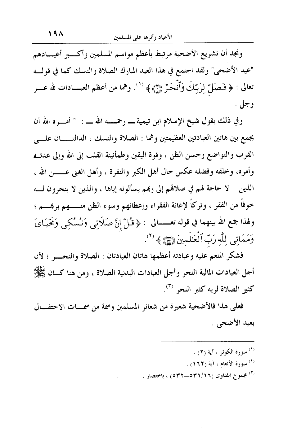 وفي ذلك يقول شيخ الإسلام ابن تيمية ـ رحمه الله ـ: " أمره الله أن يجمع بين هاتين العبادتين العظيمتين وهما: الصلاة والنسك، الدالتان على القرب والتواضع وحسن الظن، وقوة اليقين وطمأنينة القلب إلى الله وإلى عدته وأمره، وخلقه وفضله عكس حال أهل الكبر والنفرة، وأهل الغنى عن الله، الذين لا حاجة لهم في صلاتهم إلى ربهم يسألونه إياها، والذين لا ينحرون له خوفاً من الفقر، وتركاً لإعانة الفقراء وإعطائهم وسوء الظن منهم بربهم؛ ولهذا جمع الله بينهما في قوله تعالى: {قُلْ إِنَّ صَلاتِي وَنُسُكِي وَمَحْيَايَ وَمَمَاتِي لِلَّهِ رَبِّ الْعَالَمِينَ} 2.