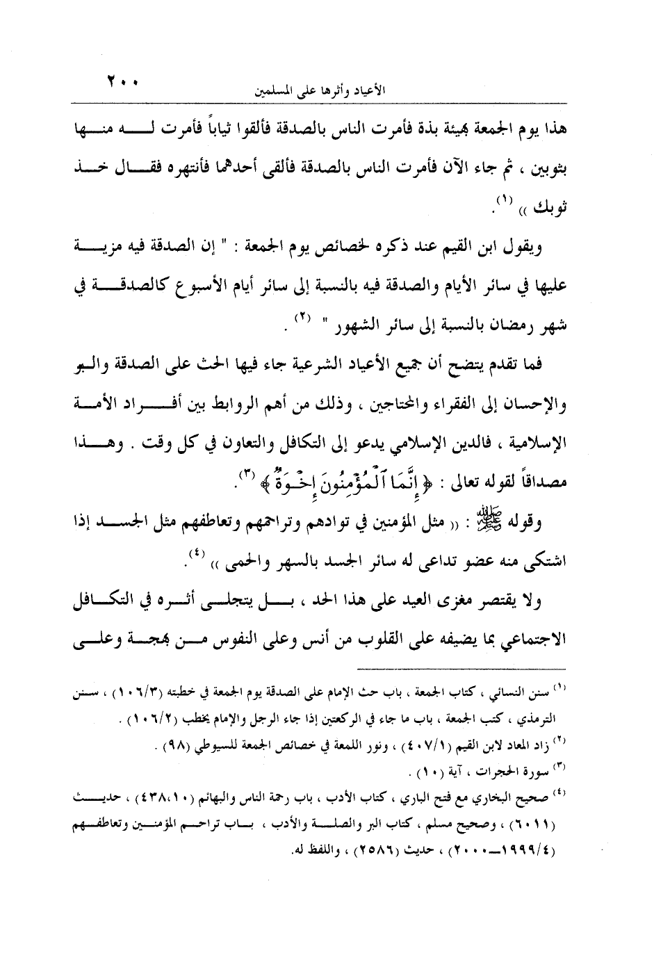 فما تقدم يتضح أن جميع الأعياد الشرعية جاء فيها الحث على الصدقة والبر والإحسان إلى الفقراء والمحتاجين، وذلك من أهم الروابط بين أفراد الأمة الإسلامية، فالدين الإسلامي يدعو إلى التكافل والتعاون في كل وقت. وهذا مصداقاً لقوله تعالى: {إِنَّمَا الْمُؤْمِنُونَ إِخْوَةٌ} 3.