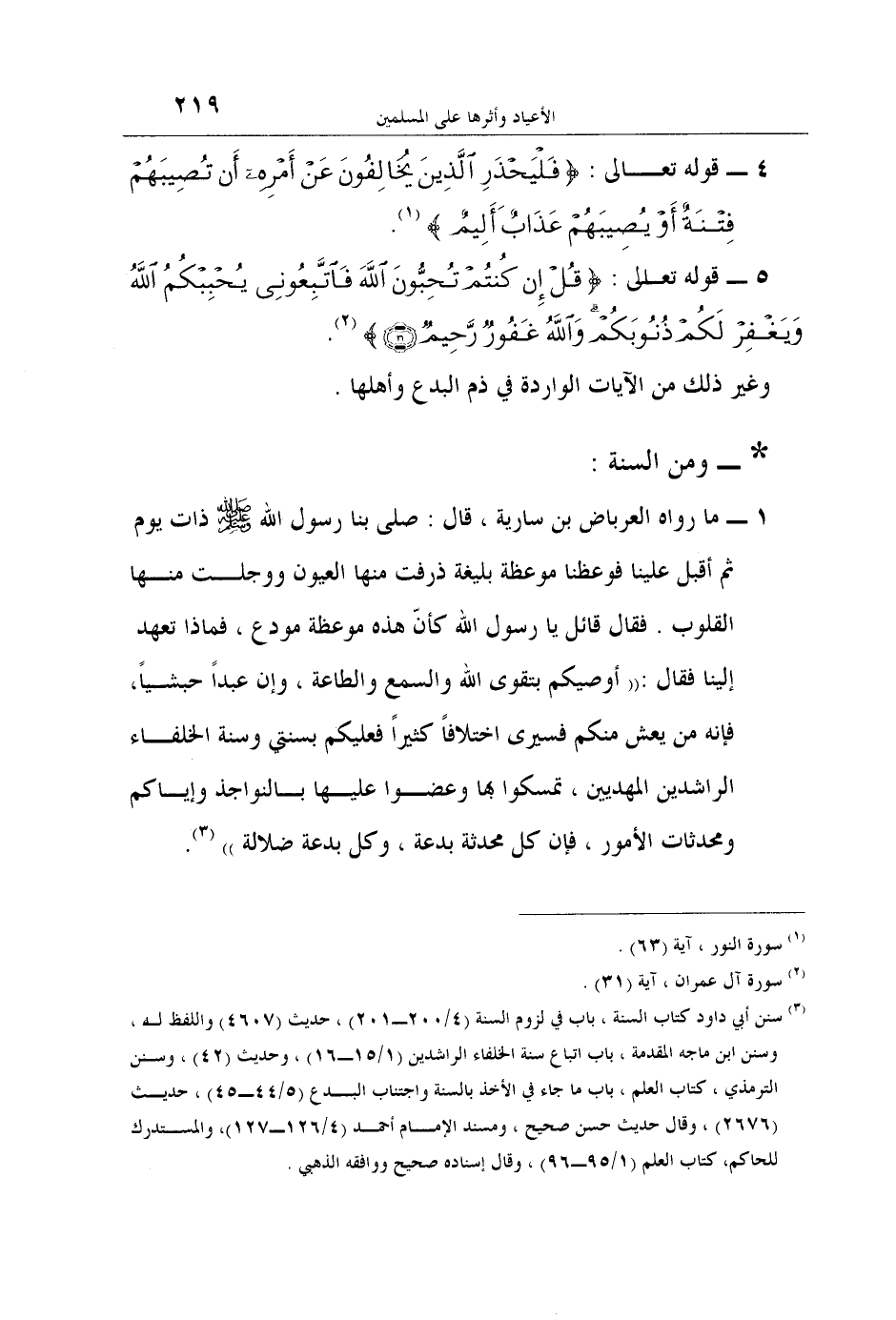 3 سنن أبي داود كتاب السنة، باب في لزوم السنة (4/200ـ201) ، حديث (4607) واللفظ له، وسنن ابن ماجه المقدمة، باب اتباع سنة الخلفاء الراشدين (1/15ـ16) ، وحديث (42) ، وسنن الترمذي، كتاب العلم، باب ما جاء في الأخذ بالسنة واجتناب البدع (5/44ـ45) ، حديث (2676) ، وقال حديث حسن صحيح، ومسند الإمام أحمد (4/126ـ127) ، والمستدرك للحاكم، كتاب العلم (1/95ـ96) ، وقال إسناده صحيح ووافقه الذهبي.
