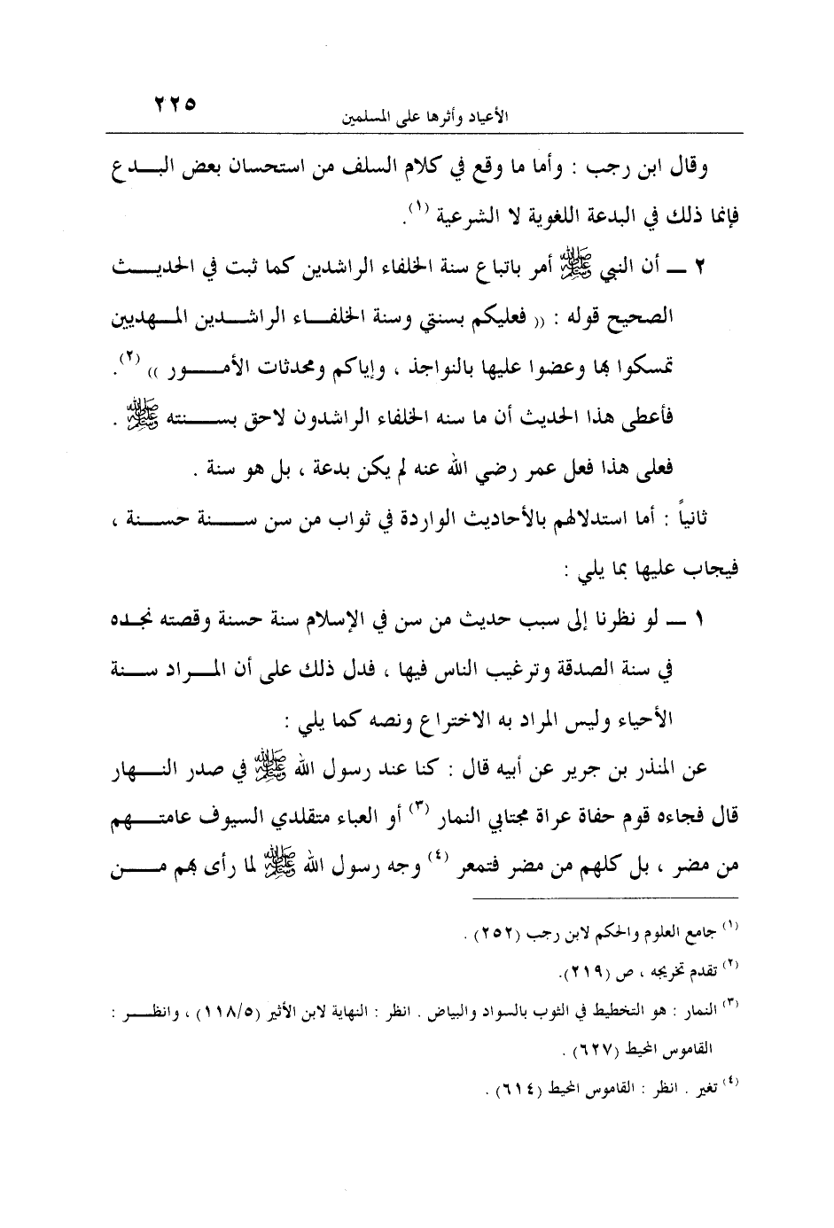 2 ـ أن النبي صلى الله عليه وسلم أمر باتباع سنة الخلفاء الراشدين كما ثبت في الحديث الصحيح قوله: "فعليكم بسنتي وسنة الخلفاء الراشدين المهديين تمسكوا بها وعضوا عليها بالنواجذ، وإياكم ومحدثات الأمور" 2. فأعطى هذا الحديث أن ما سنه الخلفاء الراشدون لاحق بسنته صلى الله عليه وسلم. فعلى هذا فعل عمر رضي الله عنه لم يكن بدعة، بل هو سنة.