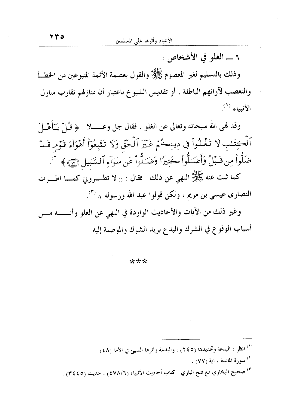 وغير ذلك من الآيات والأحاديث الواردة في النهي عن الغلو وأنه من أسباب الوقوع في الشرك والبدع بريد الشرك والموصلة إليه.