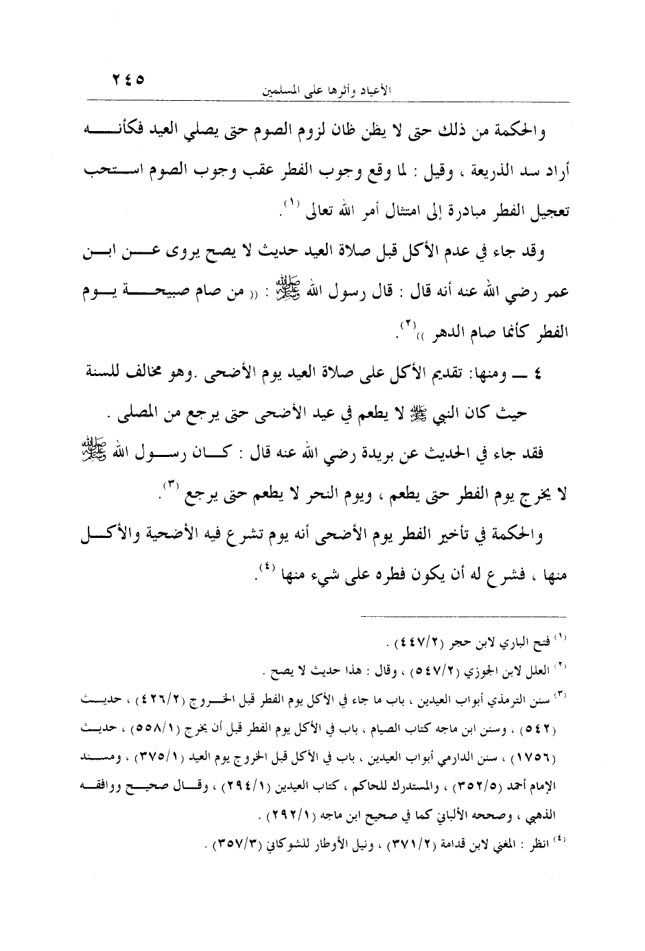 3 سنن الترمذي أبواب العيدين، باب ما جاء في الأكل يوم الفطر قبل الخروج (2/426) ، حديث (542) ، وسنن ابن ماجه كتاب الصيام، باب في الأكل يوم الفطر قبل أن يخرج (1/558) ، حديث (1756) ، سنن الدارمي أبواب العيدين، باب في الأكل قبل الخروج يوم العيد (1/375) ، ومسند الإمام أحمد (5/352) ، والمستدرك للحاكم، كتاب العيدين (1/294) ، وقال صحيح ووافقه الذهبي، وصححه الألباني كما في صحيح ابن ماجه (1/292) .