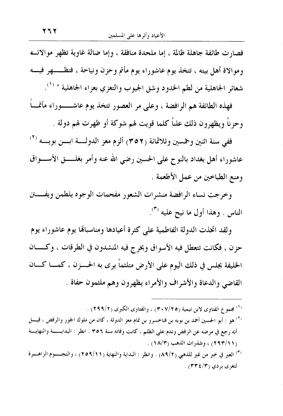 فصارت طائفة جاهلة ظالمة، إما ملحدة منافقة، وإما ضالة غاوية تظهر موالاته وموالاة أهل بيته، تتخذ يوم عاشوراء يوم مأتم وحزن ونياحة، فتظهر فيه شعائر الجاهلية من لطم الخدود وشق الجيوب والتعزي بعزاء الجاهلية " 1.