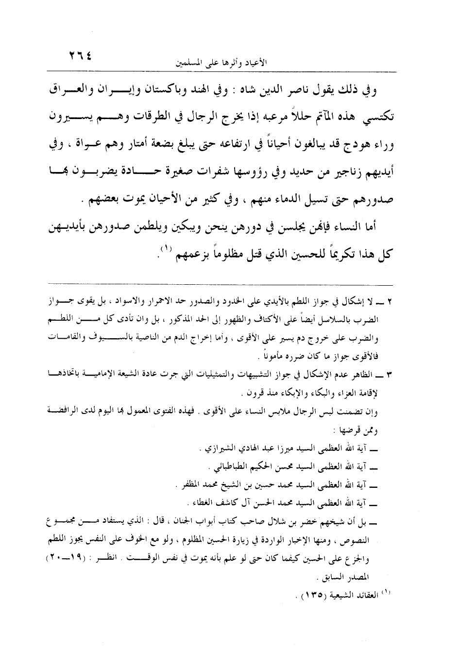 وفي ذلك يقول ناصر الدين شاه: وفي الهند وباكستان وإيران والعراق تكتسي هذه المآتم حللاً مرعبه إذا يخرج الرجال في الطرقات وهم يسيرون وراء هودج قد يبالغون أحياناً في ارتفاعه حتى يبلغ بضعة أمتار وهم عراة، وفي أيديهم زناجير من حديد وفي رؤوسها شفرات صغيرة حادة يضربون بها صدورهم حتى تسيل الدماء منهم، وفي كثير من الأحيان يموت بعضهم.