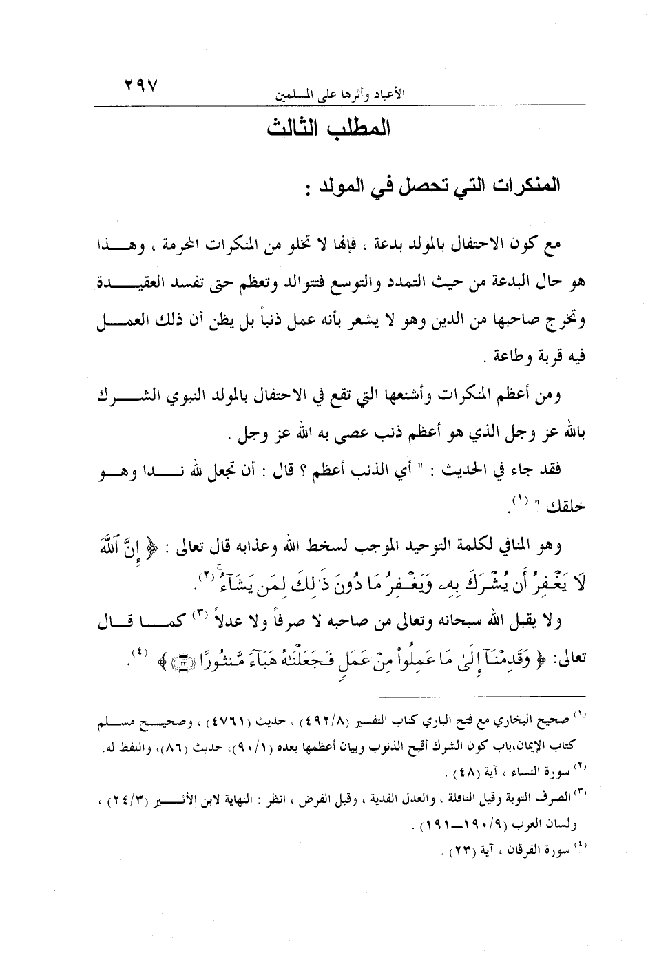 ولا يقبل الله سبحانه وتعالى من صاحبه لا صرفاً ولا عدلاً 3 كما قال تعالى: {وَقَدِمْنَا إِلَى مَا عَمِلُوا مِنْ عَمَلٍ فَجَعَلْنَاهُ هَبَاءً مَنْثُوراً} 4.
