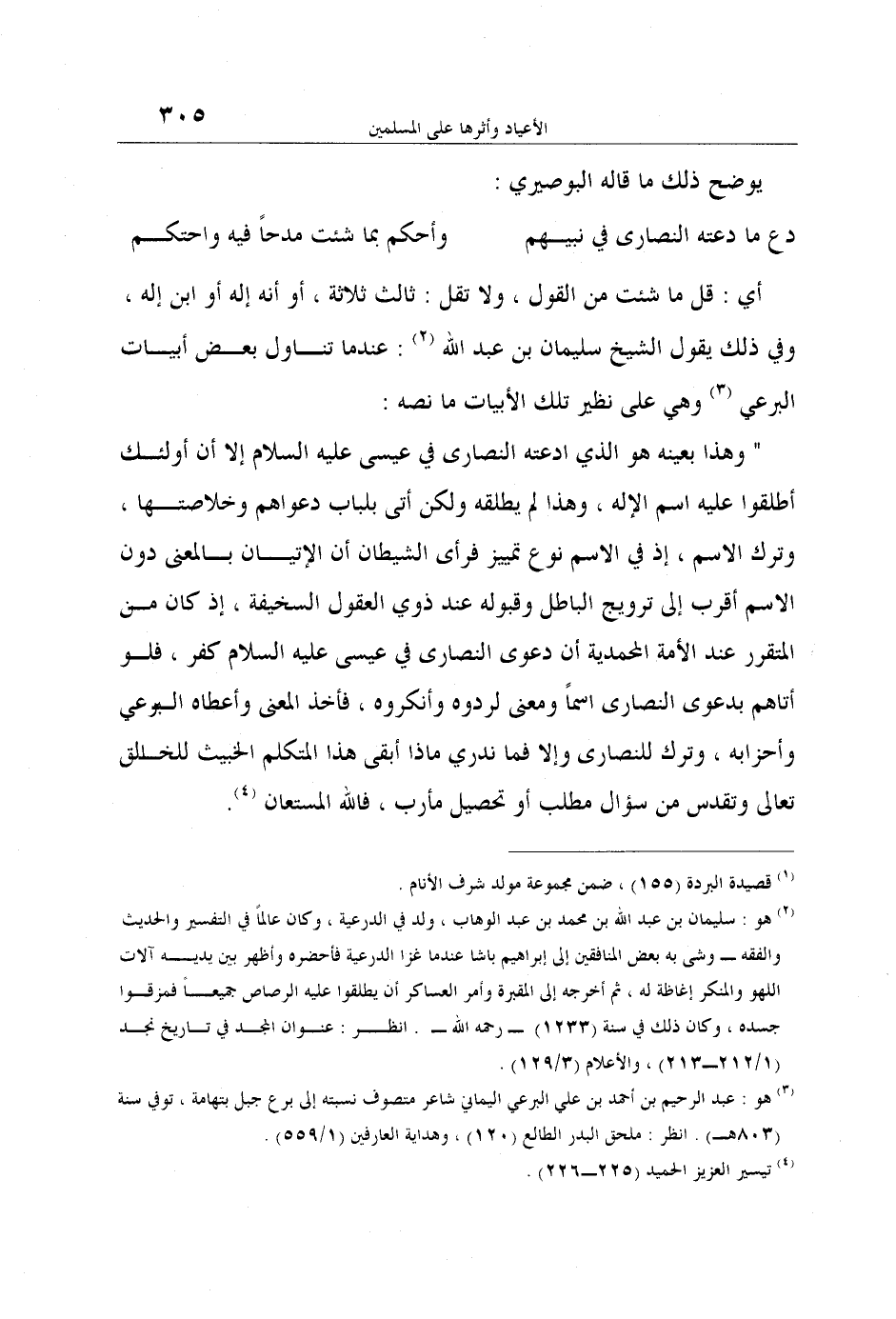 " وهذا بعينه هو الذي ادعته النصارى في عيسى عليه السلام إلا أن أولئك أطلقوا عليه اسم الإله، وهذا لم يطلقه ولكن أتى بلباب دعواهم وخلاصتها، وترك الاسم، إذ في الاسم نوع تمييز فرأى الشيطان أن الإتيان بالمعنى دون الاسم أقرب إلى ترويج الباطل وقبوله عند ذوي العقول السخيفة، إذ كان من المتقرر عند الأمة المحمدية أن دعوى النصارى في عيسى عليه السلام كفر، فلو أتاهم بدعوى النصارى اسماً ومعنى لردوه وأنكروه، فأخذ المعنى وأعطاه البرعي وأحزابه، وترك للنصارى وإلا فما ندري ماذا أبقى هذا المتكلم الخبيث للخالق تعالى وتقدس من سؤال مطلب أو تحصيل مأرب، فالله المستعان 4.