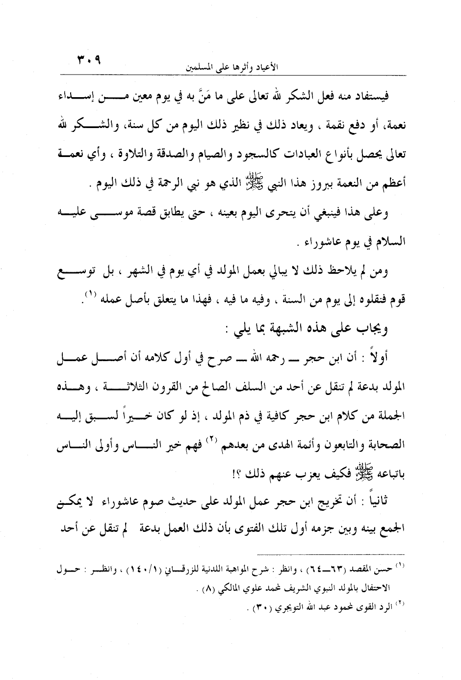 أولاً: أن ابن حجر - رحمه الله - صرح في أول كلامه أن أصل عمل المولد بدعة لم تنقل عن أحد من السلف الصالح من القرون الثلاثة، وهذه الجملة من كلام ابن حجر كافية في ذم المولد، إذ لو كان خيراً لسبق إليه الصحابة والتابعون وأئمة الهدى من بعدهم 2 فهم خير الناس وأولى الناس باتباعه صلى الله عليه وسلم فكيف يعزب عنهم ذلك؟!