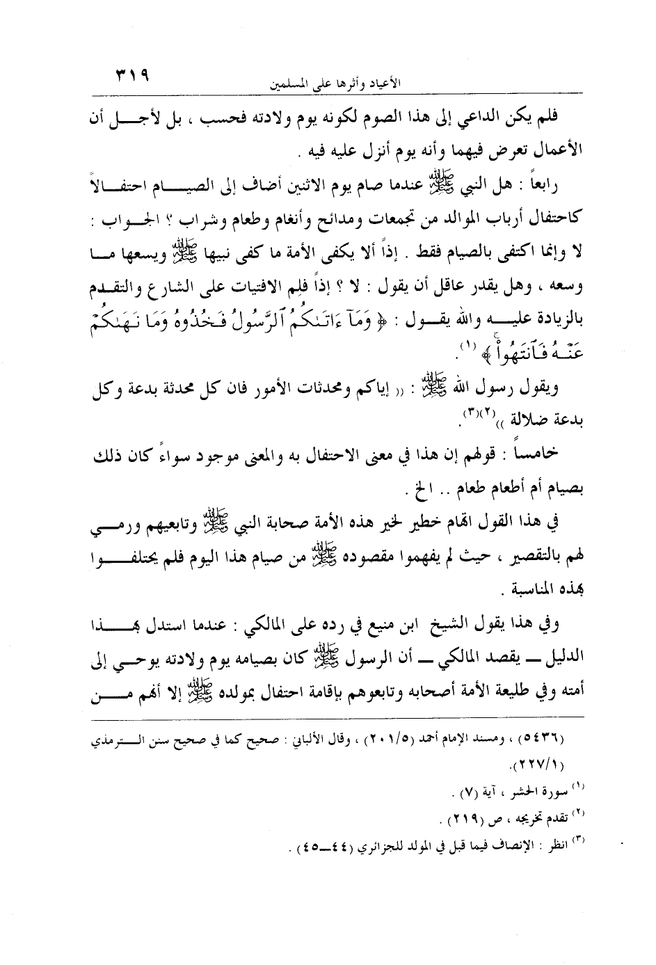 رابعاً: هل النبي صلى الله عليه وسلم عندما صام يوم الاثنين أضاف إلى الصيام احتفالاً كاحتفال أرباب الموالد من تجمعات ومدائح وأنغام وطعام وشراب؟ الجواب: لا وإنما اكتفى بالصيام فقط. إذاً ألا يكفى الأمة ما كفى نبيها صلى الله عليه وسلم ويسعها ما وسعه، وهل يقدر عاقل أن يقول: لا؟ إذاً فلِم الافتيات على الشارع والتقدم بالزيادة عليه والله يقول: {وَمَا آتَاكُمُ الرَّسُولُ فَخُذُوهُ وَمَا نَهَاكُمْ عَنْهُ فَانْتَهُوا} 1.