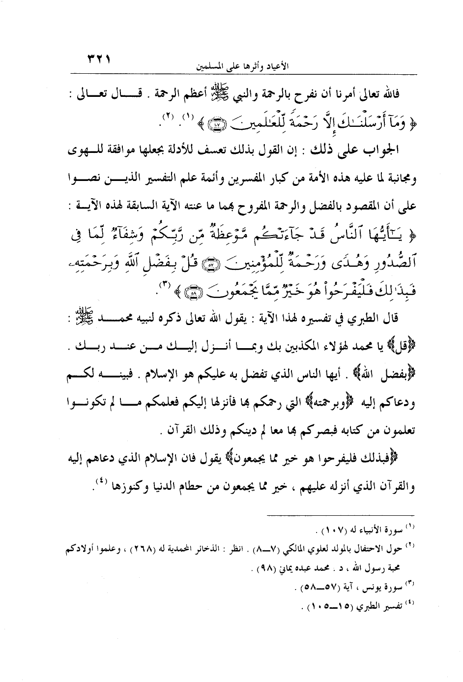الجواب على ذلك: إن القول بذلك تعسف للأدلة بجعلها موافقة للهوى ومجانبة لما عليه هذه الأمة من كبار المفسرين وأئمة علم التفسير الذين نصوا على أن المقصود بالفضل والرحمة المفروح بهما ما عنته الآية السابقة لهذه الآية: {يَا أَيُّهَا النَّاسُ قَدْ جَاءَتْكُمْ مَوْعِظَةٌ مِنْ رَبِّكُمْ وَشِفَاءٌ لِمَا فِي الصُّدُورِ وَهُدىً وَرَحْمَةٌ لِلْمُؤْمِنِينَ قُلْ بِفَضْلِ اللَّهِ وَبِرَحْمَتِهِ فَبِذَلِكَ فَلْيَفْرَحُوا هُوَ خَيْرٌ مِمَّا يَجْمَعُونَ} 3.