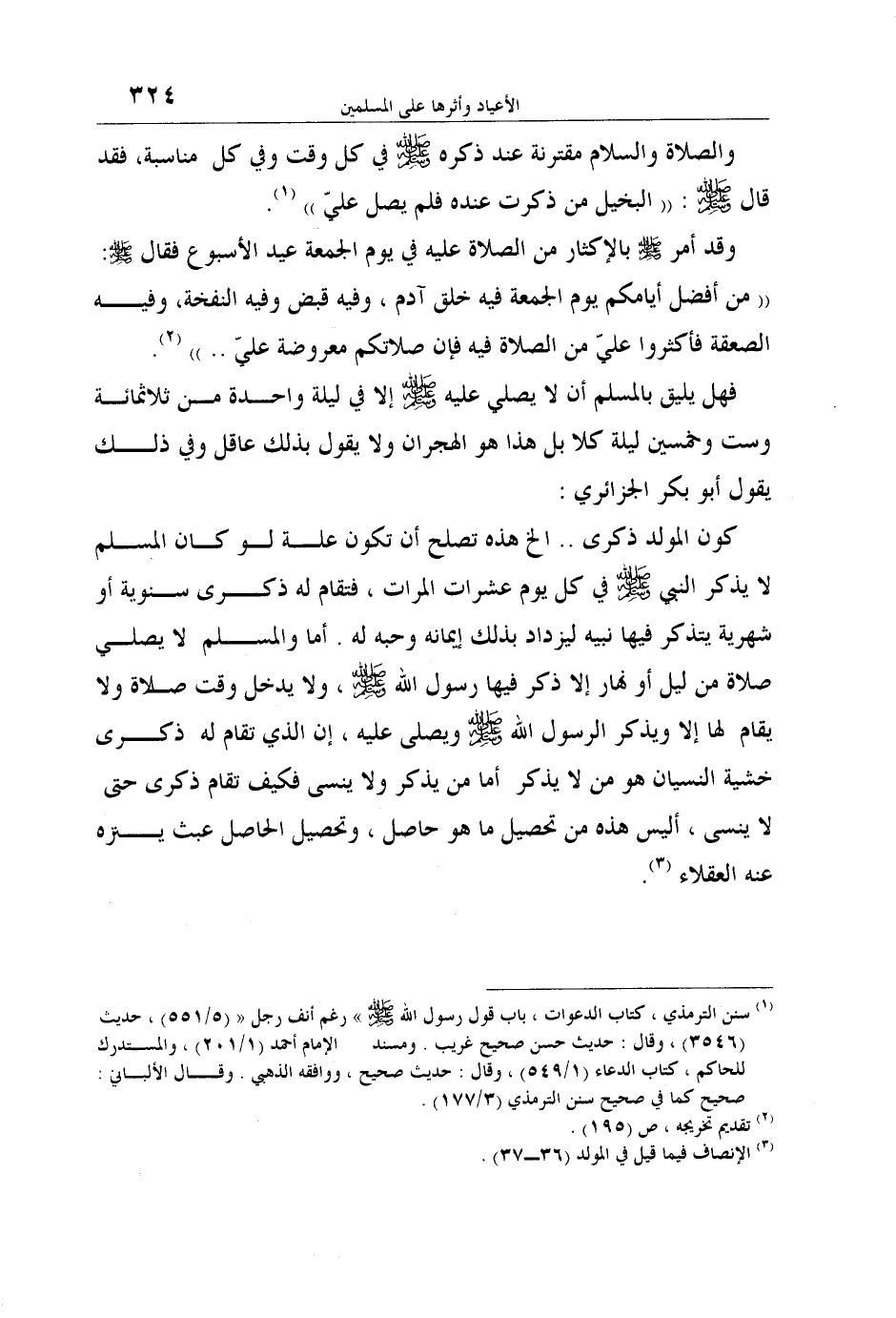 وقد أمر صلى الله عليه وسلم بالإكثار من الصلاة عليه في يوم الجمعة عيد الأسبوع فقال صلى الله عليه وسلم: "من أفضل أيامكم يوم الجمعة فيه خلق آدم، وفيه قبض وفيه النفخة، وفيه الصعقة فأكثروا عليّ من الصلاة فيه فإن صلاتكم معروضة عليّ.." 2.
