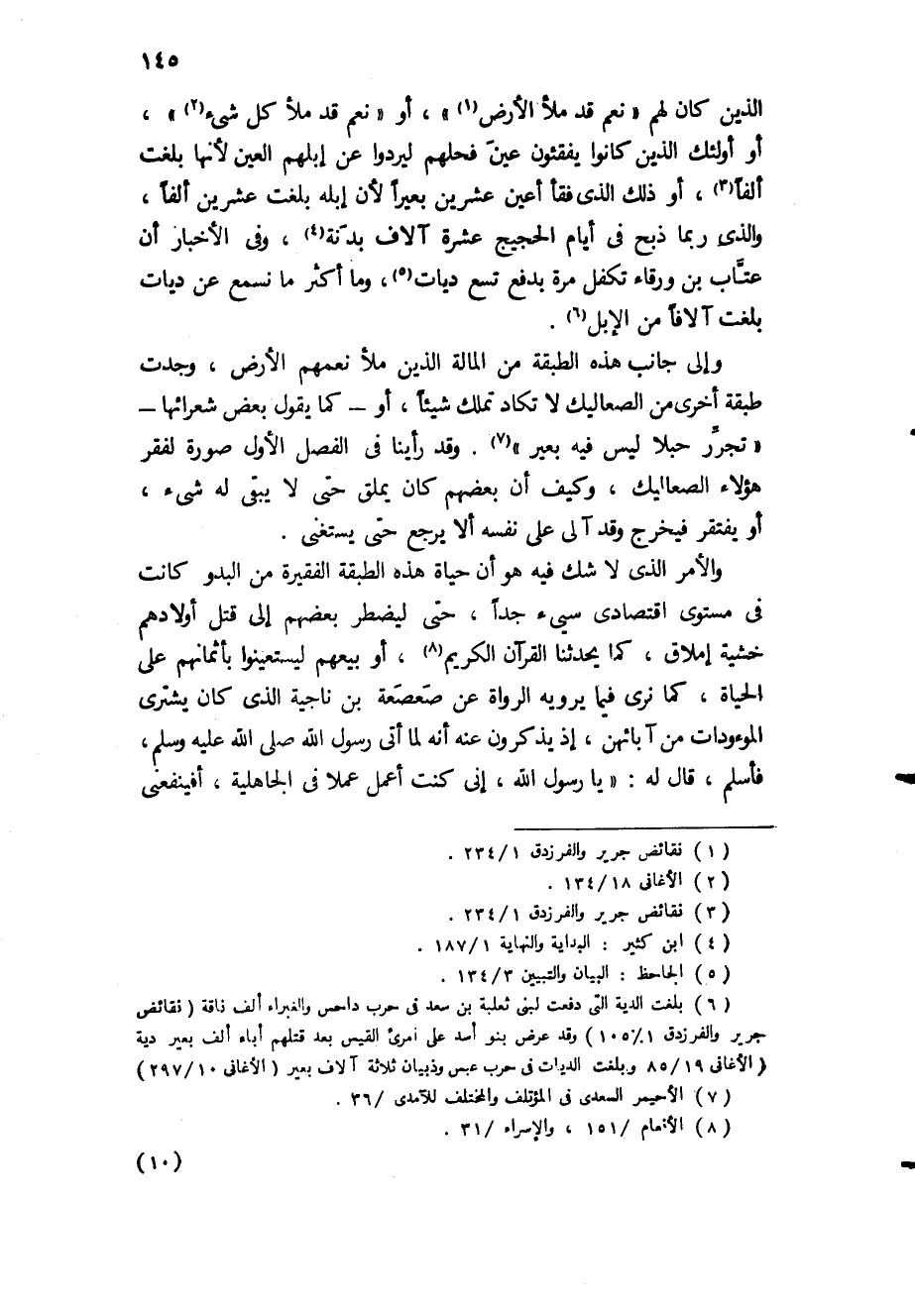 ويبدو أن هذه الغارات -مهما تختلف أسبابها المباشرة باختلاف أصحابها- يرجع سببها العام إلى اختلال التوازن الاقتصادي في ذلك المجتمع الذي يضع طائفة من أفراده بين نابين من فقر وجوع، بينما يضع في أيدي طائفة أخرى كنوز الثروة ومفاتيح الاقتصاد، وهو لا يفصل بين هاتين الطبقتين، ولا يجعل كلا منهما تعيش في عالمها الخاص، وإنما أباح لإحداهما أن تعرض ثراءها، وتتيه بما أغدق عليها أمام أعين الطائفة الأخرى، فتزيد من إحساسها بالفقر والجوع، فكان من الطبيعي -إذا ما أتيحت لهذه الطائفة البائسة الفرصة لاغتصاب أي شيء من الطائفة الأخرى- أن تنتهزها مؤمنة بأن هذا الاغتصاب حق، ما دامت لا تبغي من ورائه سوى أن تعيش.