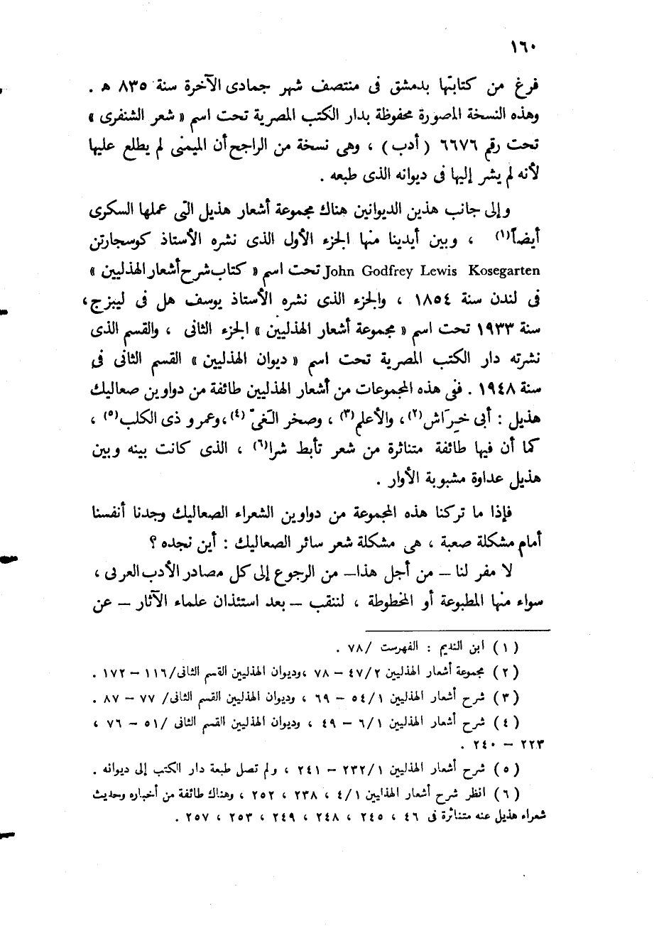 أن الذي عمله الأصمعي وأبو عمرو1، ومما يؤسف له أن يفقد هذا الديوان أيضا. ويشير صاحب الخزانة أيضا إلى ديوان تأبط شرا في نص ينقله عن ابن جني في تصحيحه رواية بيت له يقول فيه "وكذلك وجدتها في شعر هذا الرجل بالخط القديم، وهو عتيد عندي إلى الآن"2، ويذكر بركلمان في حديثه عن تأبط شرا أن "بعض مختارات من ديوانه جمعها ابن جني مخطوطة في الإسكوريال المجلد الثاني/ 778"3.