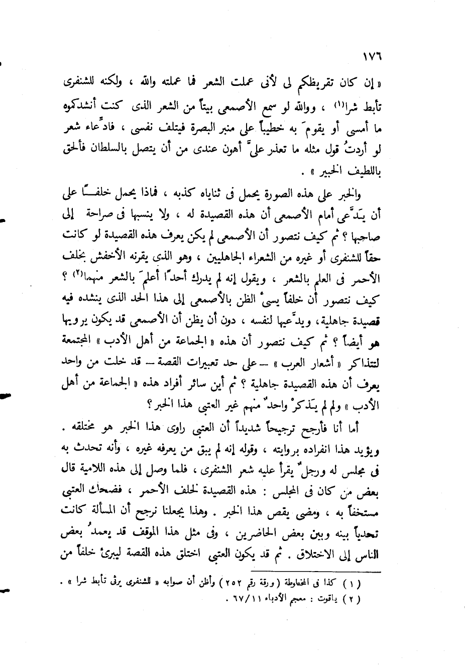 ولعل الأمر في اللامية الأخيرة "إن بالشِّعب" أيسر، فإن الشك يكتنفها اكتنافا شديدا لم تتعرض لمثله أية قصيدة أخرى من "ديوان الصعاليك"، وتكاد مصادر الأدب العربي المختلفة لا تتفق على قائلها، فهي مرة تنسب إلى تأبط شرا1، ومرة إلى ابن أخت تأبط شرا2، ومرة إلى الشنفرى3، هذا إلى جانب نسبتها إلى خلف الأحمر4، بل إن أبا تمام الذي ينسبها في حماسته في صراحة إلى تابط شرا5، ينسبها في بعض المصادر الأخرى في صراحة أيضا إلى الشنفرى6، بل الغريب أن تنسب أحيانا إلى الشنفرى في رثاء تأبط شرا7، مع أن المعروف أن الشنفرى قتل قبل تأبط شرا، وأن تابط شرا هو الذي رثاه8، والجاحظ لا يعرض لها إلا متشككا، فهو يقول مرة: "وقال تأبط شرا أو أبو محرز خلف بن حيان الأحمر"9، ويقول مرة أخرى: "وقال تأبط شرا، وإن كان قالها"10. وينقل ابن دريد بيتا منها في أسلوب المتشكك حيث يقول: "وقد رُوي البيت المنسوب إلى الشنفرى أو إلى تأبط شرا ... "11، ووضع العبارة على هذه الصورة المتشككة، والتعبير بكلمة "المنسوب"، يشعران بما كان يدور في نفس ابن دريد من الشك في صحة هذه النسبة إلى أي من الشاعرين. ويقول ابن عبد ربه: "ويقال