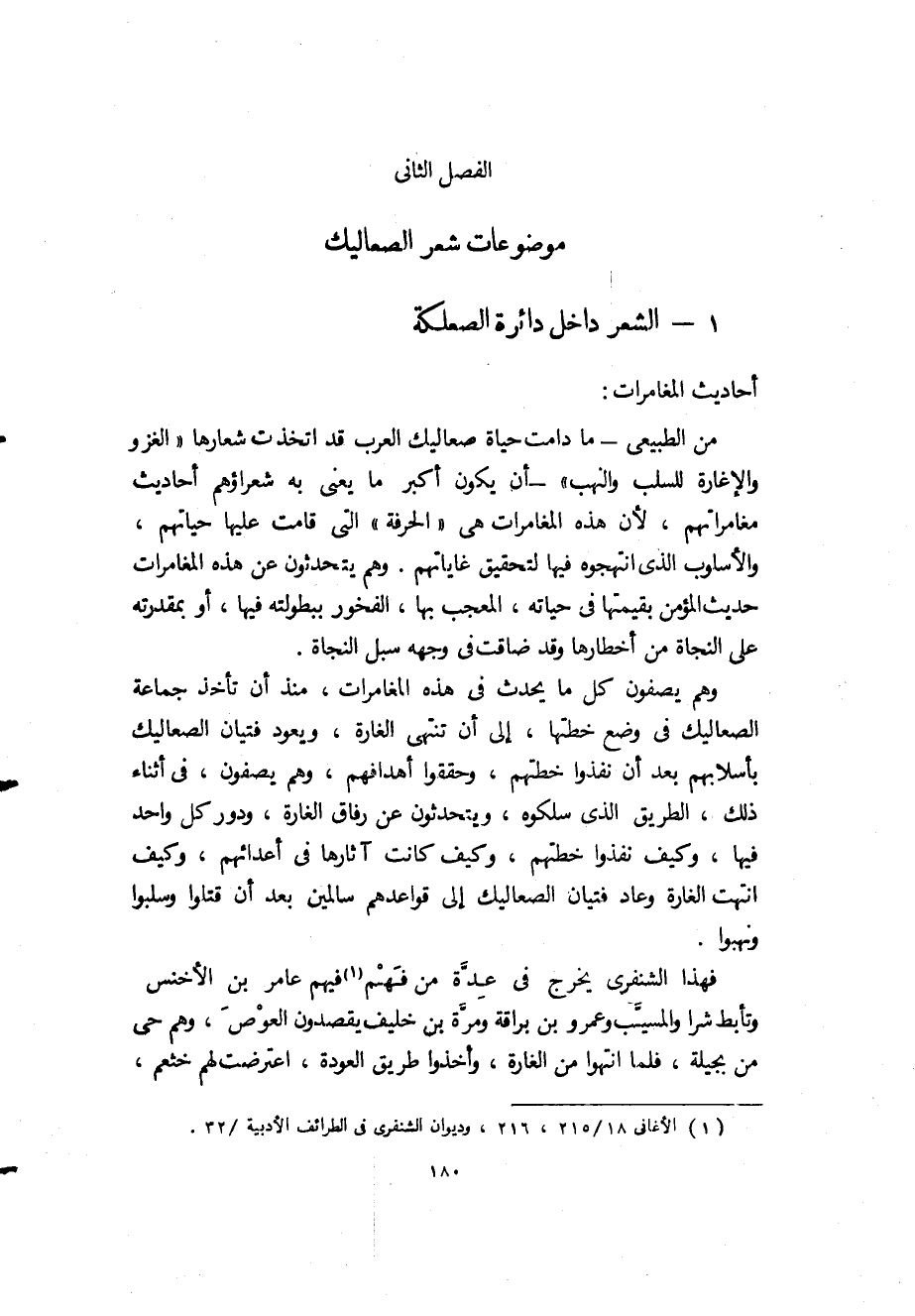 هذه من الناحية التاريخية، أما من الناحية الفنية فإن أول ما يلفت نظرنا أن هذه اللامية طويلة طولا ليس مألوفا في شعر الصعاليك، وسنرى فيما بعد أن شعر الصعاليك كان في مجموعة شعر مقطوعات، فهذه اللامية تبلغ ثمانية وستين بيتا، في حين لا تزيد أطول قصيدة في "ديوان الصعاليك" وهي تائية الشنفرى المفضلية على خمسة وثلاثين بيتا في بعض المصادر4، أي أن هذه اللامية تبلغ ضعف أطول قصيدة في ديوان الصعاليك تقريبا وإلى جانب هذه نلاحظ قلة الاضطراب في رواية ألفاظها، وفي ترتيب أبياتها، وهي ظاهرة ليست مألوفة في شعر الصعاليك، فقد لاحظنا في أول هذا الفصل أن مما يميز شعر الصعاليك الاضطراب في رواية ألفاظه وترتيب أبياته. فإذا أضفنا إلى هذا ما لاحظه كرنكو5 من قلة أسماء المواضع والأشخاص فيها، وهي ظاهرة ليست طبيعية في قصائد الشعر العربي المبكرة، زادت كفة الشك في صحة نسبة هذه اللامية إلى الشنفرى في الرجحان.