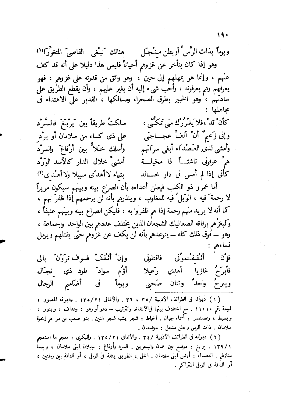 1 ديوان الهذليين 2/ 159، 160 - أوفى: أشرف. الحرف من الجبل: أعلاه المحدد، وقد رجحنا من قبل أنها هنا تحريف صوابه "الحرث" بمعنى النبات، بدليل "المقاضيب" التي تأتي بعدها، وهي الأرض تنبت النبات الرطب. ذلق الفأس: حدها. السرب: الشائع الذي يتسرب فيه الناس بعضهم في إثر بعض. الدعبوب: الموطوء. الجذل: العود.