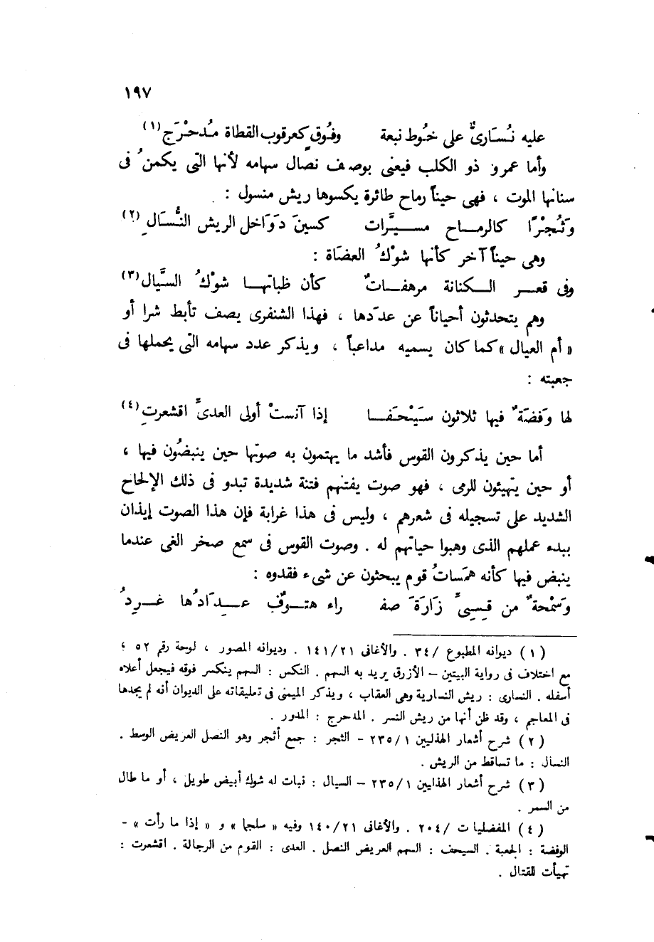 4 الأغاني 18/ 216، وديوان الشنفرى في الطرائف الأدبية /32 - لضمير في "بهن" يعود على السيوف المفهومة من السياق.