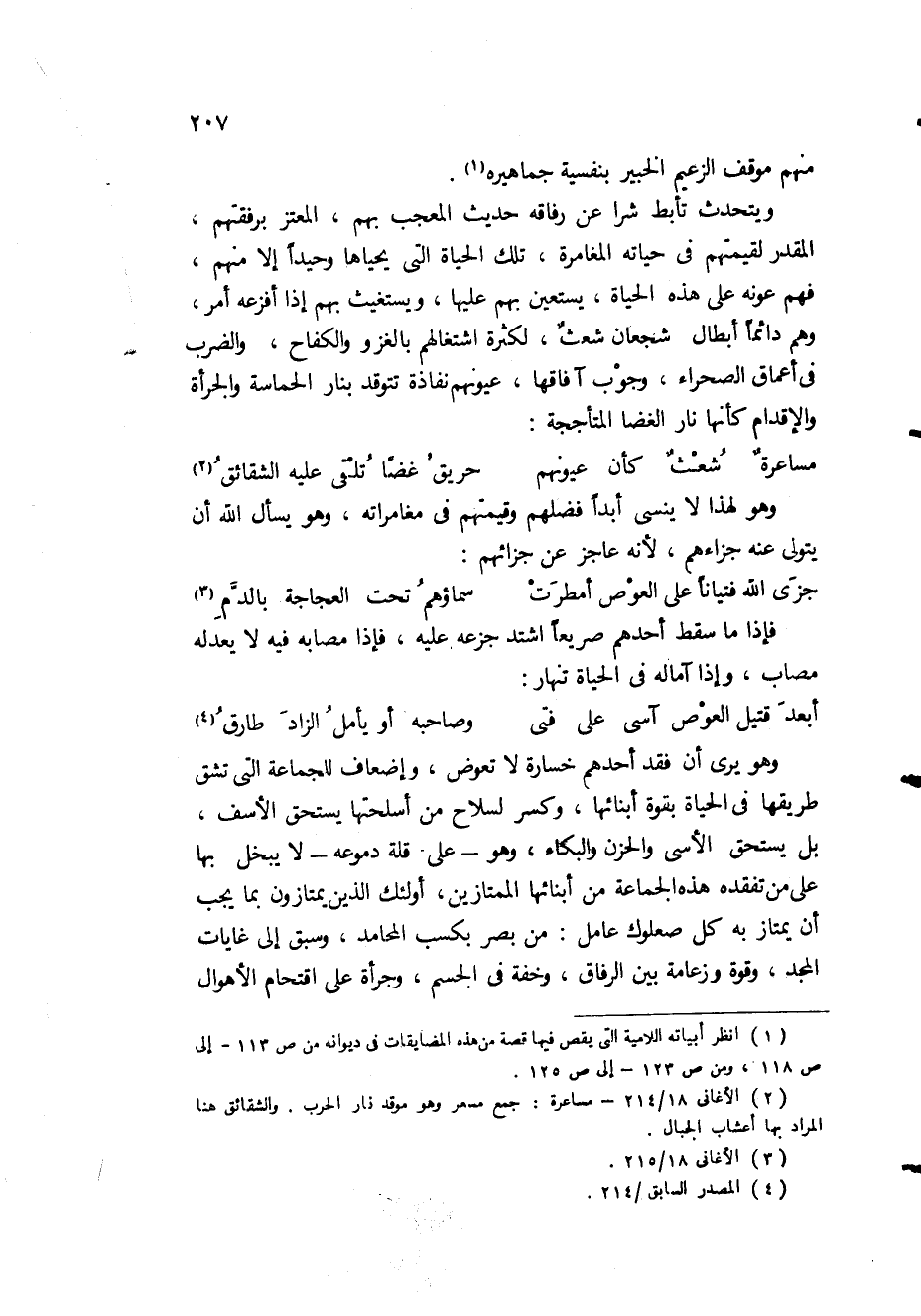 1 أوتحت: أفلت. العيل: الفقر. قوله "أي آل تألت" يعني أي سياسة ساست، يقال آله أولا إذا ساسه. مصعلكة بكسر اللام: صاحبة صعاليك، وبفتحها: نحيفة. الوفضة: للقتال. المتلفت: أي الذي يتلفت إلى الحمر يطردها عن أتنه، ويُروى "المتفلت" أي الذي يتفلت إلى قتال الحمر عن عانته، والعانة: جماعة الأتن الوحشية. الجفر: الكنانة. الجراز: السيف القاطع. الحسيل: جمع حسيلة وهي أولاد البقر، شبه السيوف بأذناب الحسيل إذا رأت أمهاتها فجعلت تحرك أذنابها.