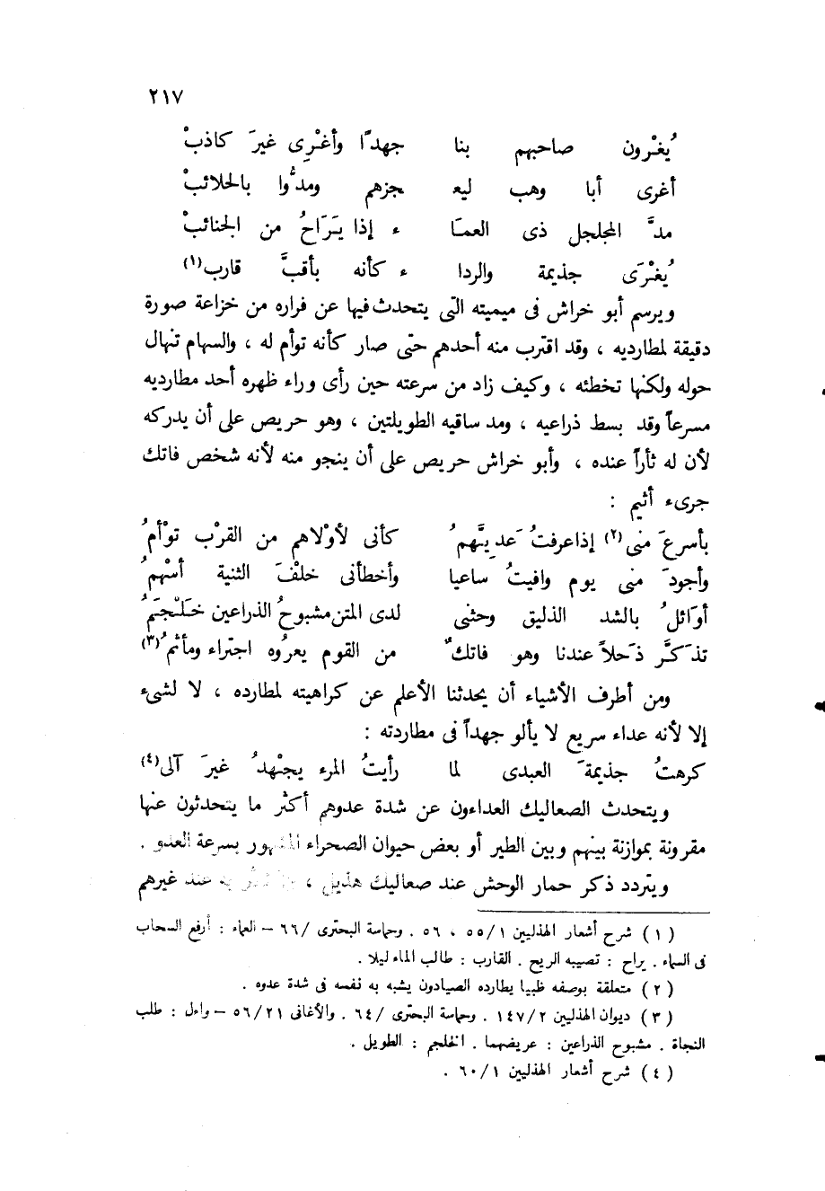 3 المفضليات / 7-11. حصا قوادمه يريد به الظليم، والأحص: الذي تناثر ريشه وتكسر، والقوادم من ريش الجناح: ما ولي الرأس. وأم خشف يريد بها الظبية. والشث والطباق: من نبت السراة، وإنما خصهما لأنهما يضمران ما يرعاهما من الحيوان، ويشدان لحمه، وذا عذر يعني به فرسا، والعذر: ما أقبل من شعر الناصية على الوجه. الربد: أعلى الجبل، وإنما خص جارح الجبل لأنه أسرع طيرانا من جارح السيل. الواله: الذاهب العقل. والقبيض: السريع. والغيداق: الكثير الواسع.