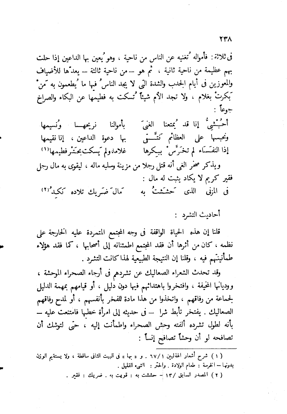 وما دام الأمر كذلك فليرسموا لأولئك الذين آمنوا بدعوتهم خطة العمل، وليحببوها إلى قلوبهم، وليدافعوا عنها وعنهم كما دفعوهم إليها. وقد ترددت هذه المعاني كثيرا في شعرهم، ووقف عروة بن الورد بالذات -كما يقف صاحب المذهب- يدعو إلى مذهبه ويحببه إلى قلوب الناس، ويدافع عنه. وليس في هذا غرابة، فلم يكن عروة يعد نفسه صعلوكا من الصعاليك، وإنما كان يعد نفسه زعيما للصعاليك، أو داعية لفلسفة التصعلك، إن صحت العبارة. وبهذه النظرية نظر إليه رفاقه، وبحق سموه أبا الصعاليك1.