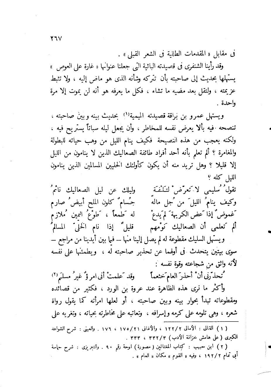 ولكن يبدو أن في هذا الحكم بعض الإطلاق، وأنه يجدر بنا أن نخفف قليلا من إطلاقه، فبين أيدينا بعض القصائد، وإن تكن قليلة جدا، لا تخضع لهذا الحكم: تائية الشنفرى وقافية تأبط شرا المفضليتان، وفائية صخر الغي وداليته، فهذه القصائد الأربع لا تخضع للوحدة الموضوعية، وإنما تتعدد موضوعاتها، وهو، وإن يكن تعددا يسيرا لا يغير من الحقيقة التي نقررها كثيرا إذ إنه في كل منه لم يتجاوز الموضوعين، فإنه على كل حال يجب أن يدعونا إلى وقفة قصيرة نحاول فيها أن نتبين السر فيه.