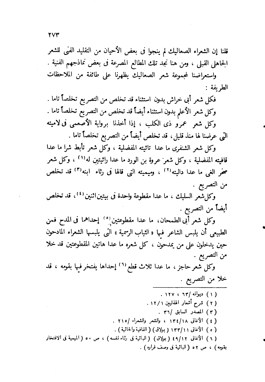وعلى كل حال فإذا صحت نسبة هذين المطلعين إلى السليك وتأبط شرا، ولم يكونا من صنع اللغويين والجغرافيين العرب، فإننا نضيفهما إلى تلك المجموعة التقليدية من شعر الصعاليك التي قلنا إنها تعد شذوذا على خصائص شعر الصعلكة وهما على كل حال لن يغيرا شيئا من الحقيقة التي قررناها، والتي نراها في أكثر نماذج شعر الصعلكة، وهي تخلصه من المقدمات الطللية.