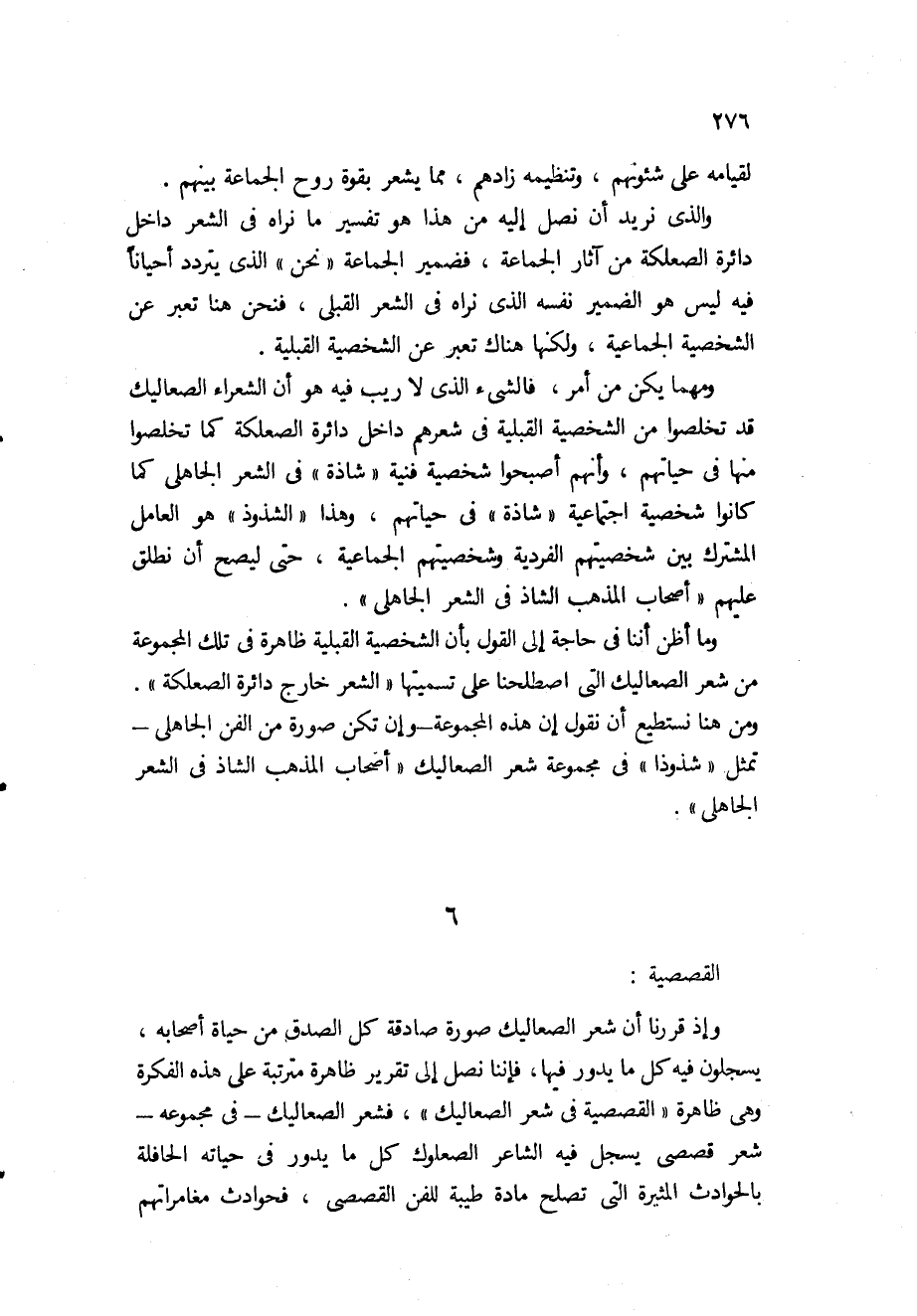 ونترك هذه الظاهرة الفرعية لنسجل ظاهرة أساسية في "الشعر داخل دائرة الصعلكة" وهي ظاهرة "التحلل من الشخصية القبلية". وهي ظاهرة ليست غريبة على شعر الصعاليك لأنها تتفق وما سجلناه من قبل في دراستنا الاجتماعية لظاهرة الصعلكة من فقد التوافق الاجتماعي بين الصعالك وقبائلهم مما ترتب عليه فقد الإحساس بالعصبية القبلية في نفوسهم. ومن الطبيعي ألا تظهر شخصية القبيلة عند شاعر فقد إحساسه بالعصبية القبلية، وما دامت الصلة بين الشعراء الصعاليك وبين قبائلهم قد انقطعت اجتماعيا فمن الطبيعي أن تنقطع فنيا، ونعني بانقطاعها فنيا تحلل الشاعر الصعلوك من ذلك "العقد الفني" الذي نراه بين الشاعر القبلي وقبيلته، فلا يكون الشاعر الصعلوك "لسان عشيرته" لأن ما بينه وبين عشيرته قد انقطع، ولا يكون شعره "صحيفة