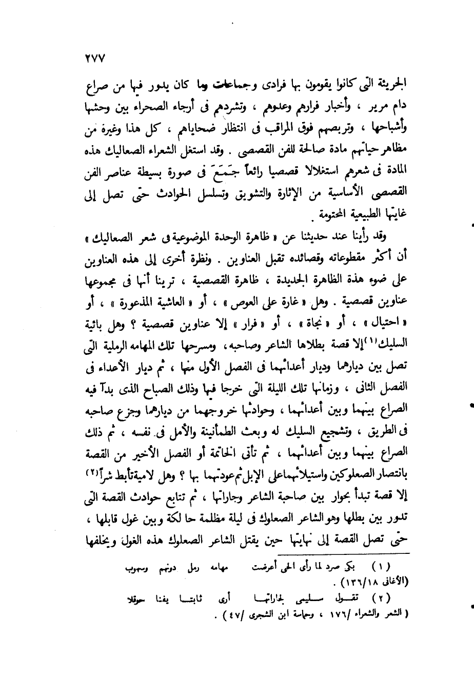 قبيلته" لأنه لم تعد له قبيلة، وإنما يصح شعره صورة صادقة كل الصدق من حياته هو، يسجل فيه كل ما يدور فيها، ويصبح ضمير الفرد "أنا" أداة التعبير فيه بدلا من ضمير الجماعة "نحن" الذي هو أداة التعبير في الشعر القبلي، وتصبح المادة الفنية لشعره مشتقة من شخصيته هو لا من شخصية قبيلته. ومعنى هذا أن ظاهرة الفناء الفني لشخصية الشاعر القبلي في شخصية قبيلته التي نلاحظها بوضوح عند أصحاب المذهب القبلي في الشعر الجاهلي قد اختفت من مجموعة الشعر داخل دائرة الصعلكة. وحلت محلها ظاهرة أخرى يصح أن نطلق عليها "ظاهرة الوضوح الفني لشخصية الشاعر الصعلوك".