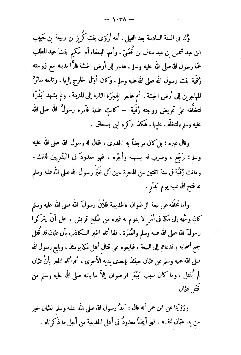 وأما تخلفه عَنْ بيعة الرضوان بالحديبية فلأن رَسُول اللَّهِ صَلَّى اللَّهُ عَلَيْهِ وَسَلَّمَ كَانَ وجهه إِلَى مكة فِي أمرٍ لا يقوم بِهِ غيره من صلح قريش، على أن يتركوا رَسُول اللَّهِ صَلَّى اللَّهُ عَلَيْهِ وَسَلَّمَ والعمرة، فلما أتاه الخبر الكاذب بأن عُثْمَان قد قتل جمع أصحابه، فدعاهم إِلَى البيعة، فبايعوه على قتال أهل مكة يومئذ، وبايع رَسُول اللَّهِ صَلَّى اللَّهُ عَلَيْهِ وَسَلَّمَ عَنْ عُثْمَان حينئذ بإحدى يديه الأخرى، ثُمَّ أتاه الخبر بأن عُثْمَان لم يقتل، وما كان سبب بيع الرضوان إلا مَا بلغه صَلَّى اللَّهُ عَلَيْهِ وَسَلَّمَ من قتل عُثْمَان وروينا عَنِ ابْن عُمَر أَنَّهُ قَالَ: يد رَسُول اللَّهِ صَلَّى اللَّهُ عَلَيْهِ وَسَلَّمَ لعثمان خير من يد عُثْمَان لنفسه. فهو أيضا معدود فِي أهل الحديبية من أجل مَا ذكرناه.