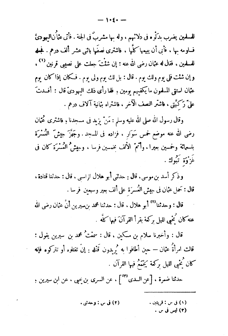 قال: وَحَدَّثَنَا [٢] أَبُو هِلال، قَالَ: حَدَّثَنَا مُحَمَّد بْن سِيرِين أن عُثْمَان رَضِيَ اللَّهُ عَنْهُ كَانَ يحيي الليل بركعة يقرأ القرآن فيها كله.