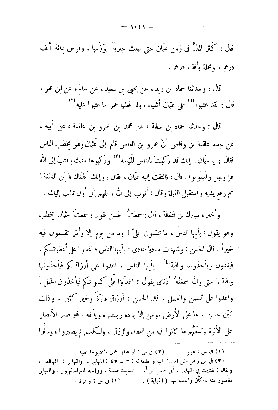 وأخبرنا مبارك بْن فَضَالَة، قَالَ: سمعت الْحَسَن يَقُول: سمعت عُثْمَان يخطب وَهُوَ يَقُول: يا أيها الناس، مَا تنقمون علي! وما من يَوْم إلا وأنتم تقسمون فِيهِ خيرا. قال الْحَسَن: وشهدت مناديا ينادى: يا أيها الناس، اغدوا على أعطياتكم، فيغدون، ويأخذونها وافية [٤] . يا أيها الناس، اغدوا على أرزاقكم فيأخذونها وافية، حَتَّى والله سمعته أذناي يَقُول: اغدوا على كسواتكم، فيأخذون الحلل.