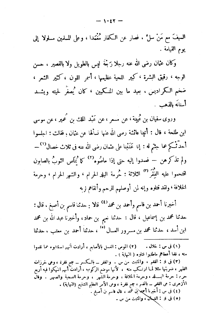 وَرَوَى سُفْيَانُ بْنُ عُيَيْنَةَ، عَنْ مِسْعَرٍ، عَنْ عَبْدِ الملك بن عمير، عن موسى ابن طَلْحَةَ، قَالَ: أَتَيْنَا عَائِشَةَ رَضِيَ اللَّهُ عَنْهَا نَسْأَلُهَا عَنْ عُثْمَانَ، فَقَالَتْ: اجْلِسُوا أُحَدِّثُكُمْ عَمَّا جِئْتُمْ لَهُ: إِنَّا عَتَبْنَا عَلَى عُثْمَانَ رَضِيَ اللَّهُ عَنْهُ فِي ثَلاثِ خِصَالٍ [١]- وَلَمْ تَذْكُرُهُنَّ- فَعَمَدُوا إِلَيْهِ حَتَّى إِذَا مَاصُّوهُ [٢] كَمَا يُمَاصُّ الثَّوْبُ بِالصَّابُونِ اقْتَحَمُوا عَلَيْهِ الْفِقُرَ [٣] الثَّلاثَةَ: حُرْمَةَ الْبَلَدِ الْحَرَامِ، وَالشَّهْرِ الْحَرَامِ، وَحُرْمَةَ الْخِلافَةِ، وَلَقَدْ قتلوه وإنه لمن أوصلهم للرحمن وَأَتْقَاهُمْ لِرَبِّهِ أَخْبَرَنَا أَحْمَدُ بْنُ قَاسِمٍ وَأَحْمَدُ بْنُ مُحَمَّدٍ [٤] قَالا: حَدَّثَنَا قَاسِمُ بْنُ أَصْبَغَ، قَالَ: