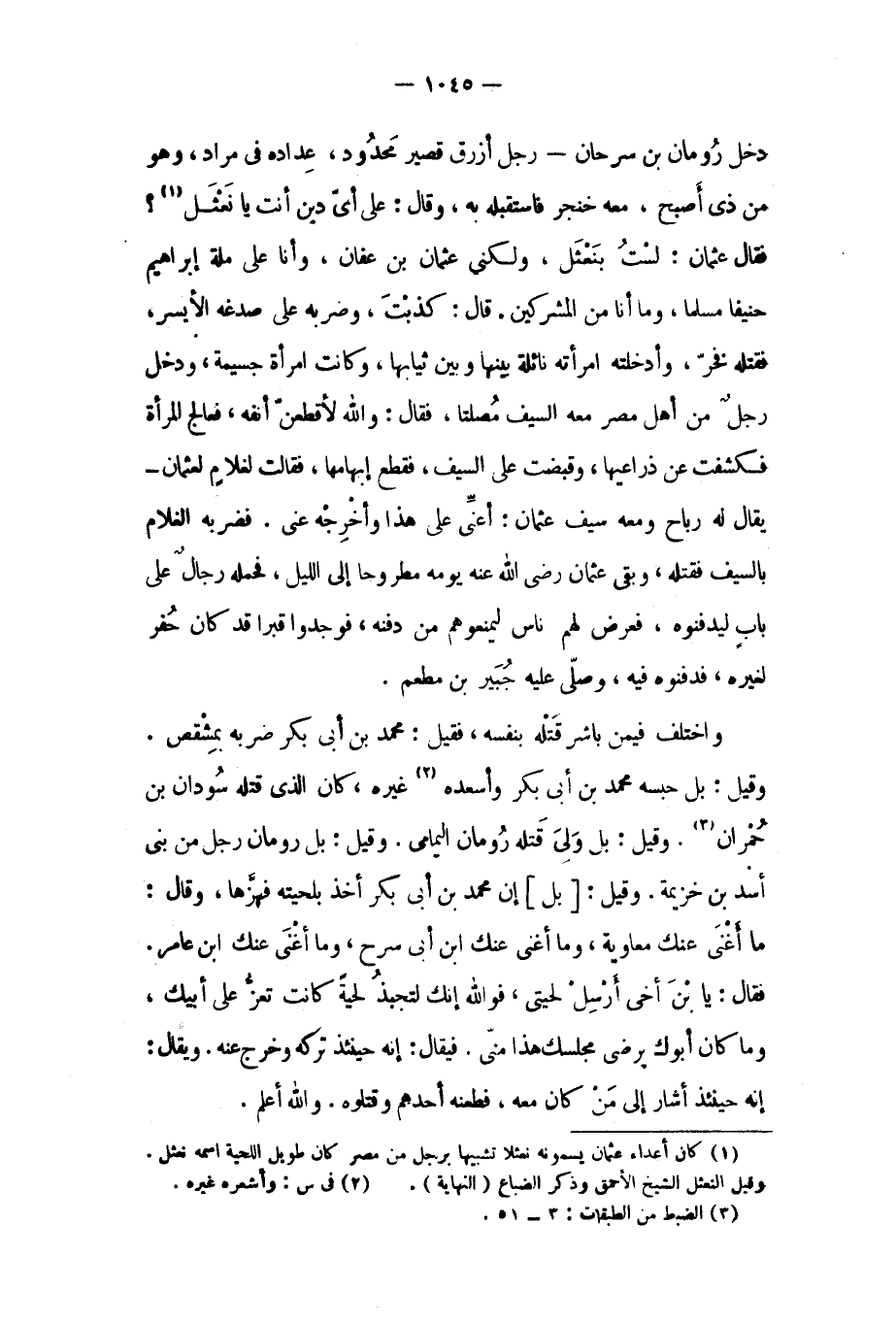 دخل رومان بْن سرحان- رجل أزرق قصير محدود، عداده فِي مراد، وَهُوَ من ذي أصبح، معه خنجر فاستقبله بِهِ، وَقَالَ: على أي دين أنت يَا نعثل [١] ؟