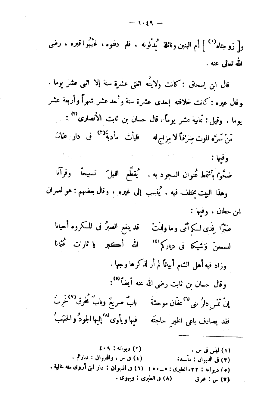 وقال غيره: كانت خلافته إحدى عشرة سنة وأحد عشر شهرا وأربعة عشر يوما. وقيل: ثمانية عشر يوما. قال حسان بن ثابت الأنصاري [٢] :