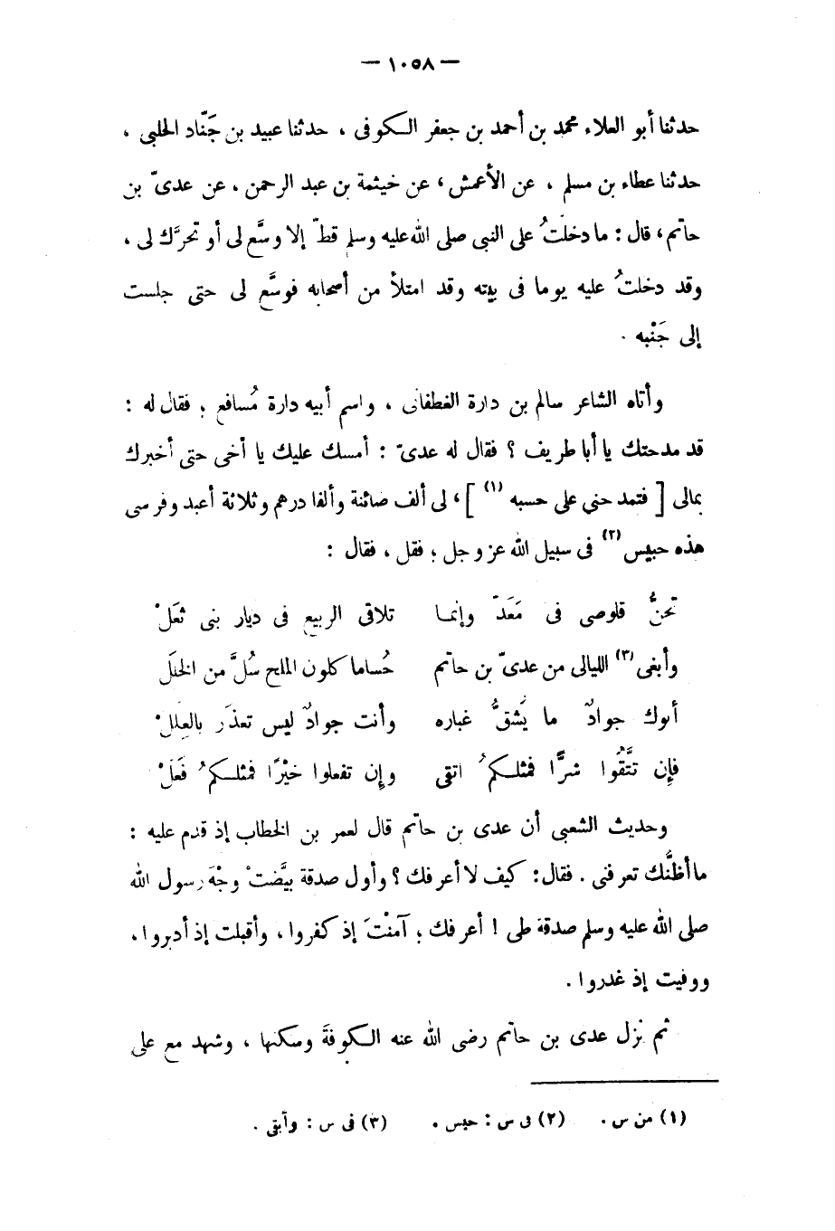 وحديث الشَّعْبِيّ أن عدي بْن حَاتِم قَالَ لعمر بْن الخطاب إذ قدم عَلَيْهِ:
