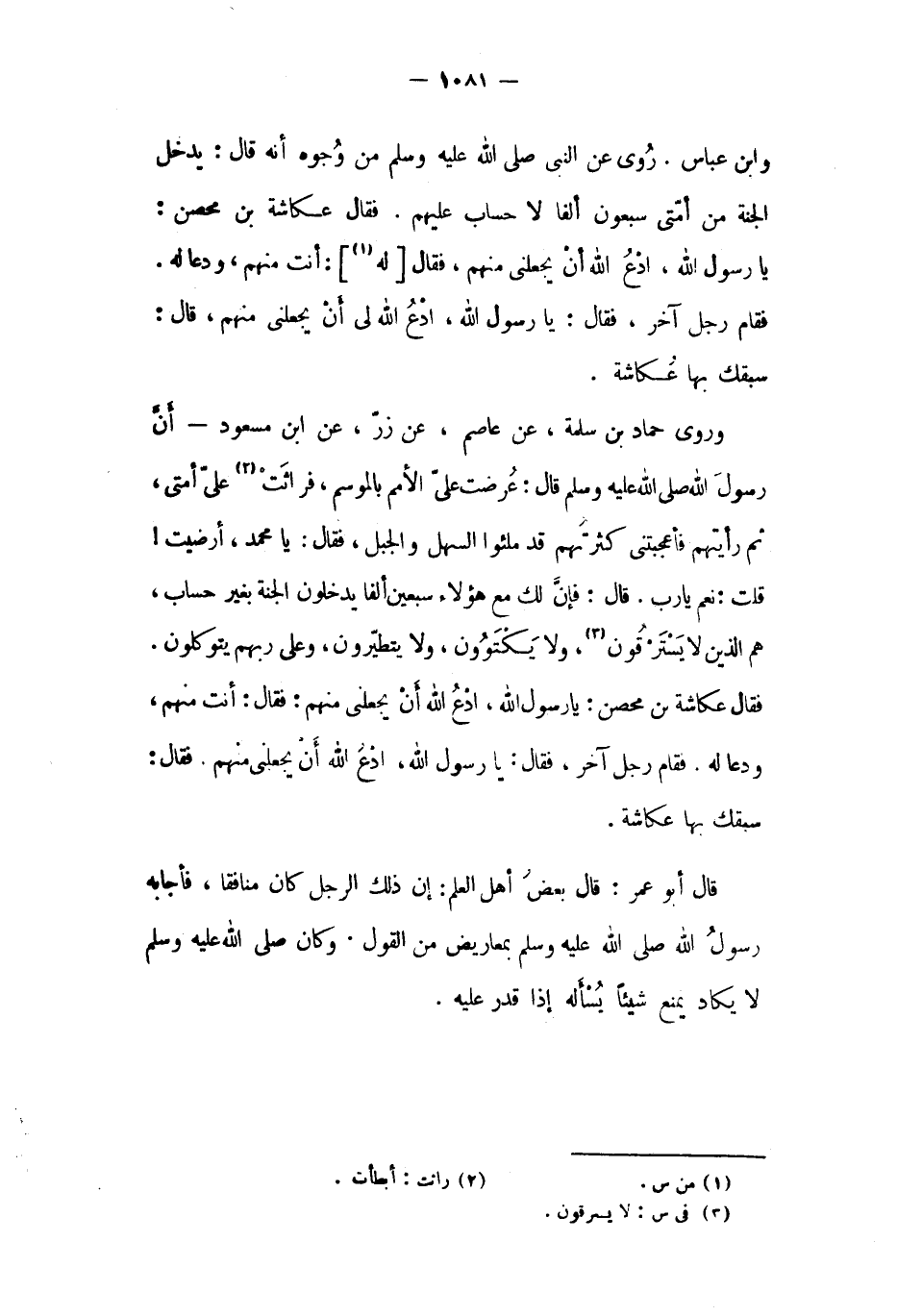وَابْن عَبَّاس. روي عَنِ النَّبِيّ صَلَّى اللَّهُ عَلَيْهِ وَسَلَّمَ من وجوه أَنَّهُ قَالَ: يدخل الجنة من أمتي سبعون ألفا لا حساب عليهم. فقال عكاشة بْن محصن: