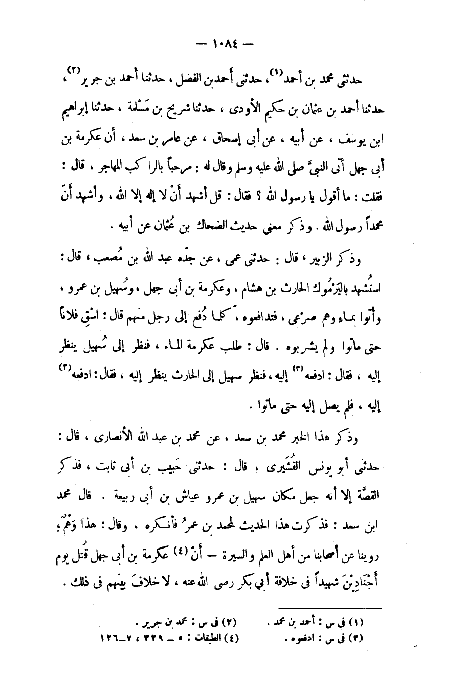 حَدَّثَنِي أَبُو يُونُس القشيري، قَالَ: حَدَّثَنِي حَبِيب بْن أَبِي ثَابِت، فذكر القصة إلا أَنَّهُ جعل مكان سهيل بْن عَمْرو عَيَّاش بْن أبى ربيعة. قال محمد ابن سَعْد: فذكرت هَذَا الحديث لمحمد بْن عُمَر فأنكره، وَقَالَ: هَذَا وهم، روينا عَنْ أصحابنا من أهل العلم والسيرة- أن [٤] عكرمة بْن أَبِي جهل قتل يَوْم أجنادين شهيدا فِي خلافة أَبِي بَكْر رَضِيَ اللَّهُ عَنْهُ، لا خلاف بينهم في ذلك.