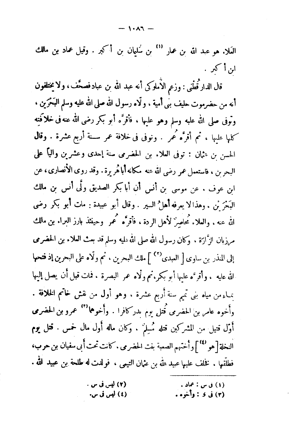 قال الدار قطنى: وزعم الأملوكي أَنَّهُ عَبْد اللَّهِ بْن عباد فصحف، ولا يختلفون أَنَّهُ من حضرموت حليف بني أُمَيَّة، ولاه رَسُول اللَّهِ صَلَّى اللَّهُ عَلَيْهِ وَسَلَّمَ البحرين، وتوفي صَلَّى اللَّهُ عَلَيْهِ وَسَلَّمَ وَهُوَ عليها، فأقره أَبُو بَكْر رَضِيَ اللَّهُ عَنْهُ فِي خلافته كلها عليها، ثُمَّ أقره عُمَر. وتوفي فِي خلافة عُمَر سنة أربع عشرة. وقال الْحَسَن بْن عُثْمَان: توفي العلاء بْن الحضرمي سنة إحدى وعشرين واليا على البحرين، فاستعمل عُمَر رَضِيَ اللَّهُ عَنْهُ مكانه أَبَا هُرَيْرَةَ. وَقَدْ رَوَى الأَنْصَارِيُّ، عَنِ ابْنِ عَوْفٍ، عَنْ مُوسَى بْنِ أَنَسٍ أَنَّ أَبَا بَكْرٍ الصِّدِّيقَ وَلَّى أَنَسَ بْنَ مَالِكٍ الْبَحْرَيْنَ، وَهَذَا لا يعرفه أهل السير. وقال أَبُو عُبَيْدَة: مات أَبُو بَكْر رَضِيَ اللَّهُ عَنْهُ، والعلاء محاصر لأهل الردة، فأقره عُمَر وحينئذ بارز البراء بْن مَالِك مرزبان الزارة، وكان رسول الله صلى الله عليه وسلم قد بعث العلاء بْن الحضرمي إِلَى المنذر بن ساوى [العبديّ [٢]] مالك البحرين، ثُمَّ ولاه على البحرين إذ فتحها الله عَلَيْهِ، وأقره عليها أَبُو بَكْر، ثُمَّ ولاه عُمَر البصرة، فمات قبل أن يصل إليها بماءٍ من مياه بني تميم سنة أربع عشرة، وَهُوَ أول من نقش خاتم الخلافة.
