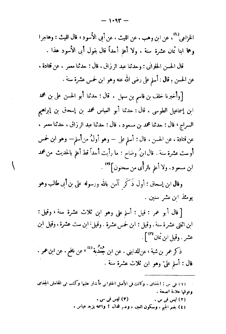 [وَأَخْبَرَنَا خَلَفُ بْنُ قَاسِمِ بْنِ سَهْلٍ، قَالَ: حدثنا أبو الحسن على بن محمد ابن إِسْمَاعِيلَ الطُّوسِيُّ، قَالَ: حَدَّثَنَا أَبُو الْعَبَّاسِ مُحَمَّدُ بْنُ إِسْحَاقَ بْنِ إِبْرَاهِيمَ السَّرَّاجُ، قَالَ: حَدَّثَنَا مُحَمَّدُ بْنُ مَسْعُودٍ، قَالَ: حَدَّثَنَا عَبْدُ الرَّزَّاقِ، حدثنا معمر، عن قتادة، عن الحسن، قال: أَسْلَمَ عَلِيٌّ- وَهُوَ أَوَّلُ مَنْ أَسْلَمَ- وَهُوَ ابْنُ خَمْسَ أَوْ سِتَّ عَشْرَةَ سَنَةً. قَالَ ابْن وَضَّاح: مَا رأيت أحدا قط أعلم بالحديث من محمد ابن مَسْعُود، ولا أعلم بالرأي من سحنون] [٢] .
