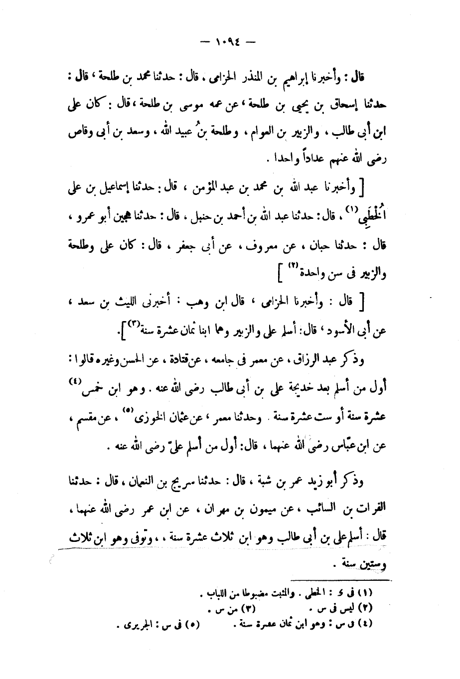 [وَأَخْبَرَنَا عَبْدُ اللَّهِ بن محمد بن عبد المؤمن، قال: حدثنا إِسْمَاعِيلُ بْنُ عَلِيٍّ الْخُطَبِيُّ [١] ، قَالَ: حَدَّثَنَا عَبْدُ اللَّهِ بْنُ أَحْمَدَ بْنِ حَنْبَلٍ، قَالَ: حَدَّثَنَا هجين أبو عمرو، قَالَ: حَدَّثَنَا حِبَّانَ، عَنْ مَعْرُوفٍ، عَنْ أَبِي جَعْفَرٍ، قَالَ: كَانَ عَلِيٌّ وَطَلْحَةُ وَالزُّبَيْرُ فِي سن واحدة [٢]] [قال: وَأَخْبَرَنَا الْحِزَامِيُّ، قَالَ ابْنُ وَهْبٍ: أَخْبَرَنِي اللَّيْثُ بْنُ سَعْدٍ، عَنْ أَبِي الأَسْوَدِ، قَالَ: أَسْلَمَ عَلِيٌّ وَالزُّبَيْرُ وَهُمَا ابْنَا ثَمَانِ عَشْرَةَ سَنَةً [٣]] .