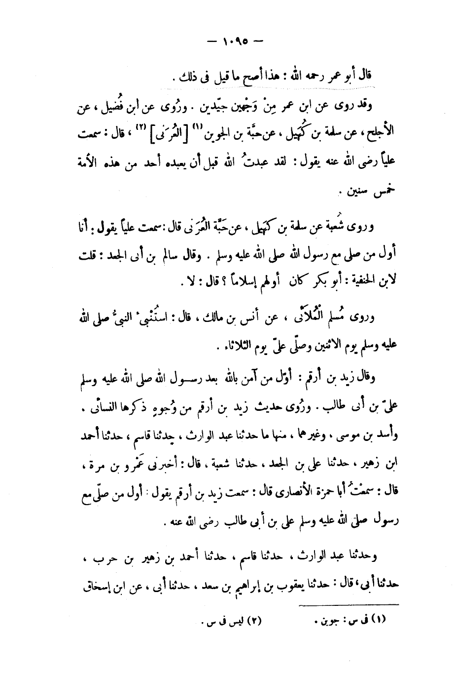 وقد روي عَنِ ابْن عُمَر من وجهين جيدين. وَرُوِيَ عَنِ ابْنِ فُضَيْلٍ، عَنِ الأَجْلَحِ، عَنْ سَلَمَةَ بْنِ كُهَيْلٍ، عَنْ حَبَّةَ بْنِ الْجُوَيْنِ [١] [الْعُرَنِيِّ] [٢] ، قَالَ: سَمِعْتُ عَلِيًّا رَضِيَ اللَّهُ عَنْهُ يَقُولُ: لَقَدْ عَبَدْتُ اللَّهَ قَبْلَ أَنْ يَعْبُدَهُ أَحَدٌ مِنْ هَذِهِ الأُمَّةِ خَمْسَ سِنِينَ. وروى شُعْبَة عَنْ سَلَمَة بْن كهيل، عَنْ حبة العرني قَالَ: سمعت عليا يَقُول: أنا أول من صَلَّى مع رسول الله صلى الله عليه وسلم. وقال سالم بن أنى الْجَعْد: قلت لابن الحنفية: أَبُو بَكْر كَانَ أولهم إسلاما؟ قَالَ: لا.