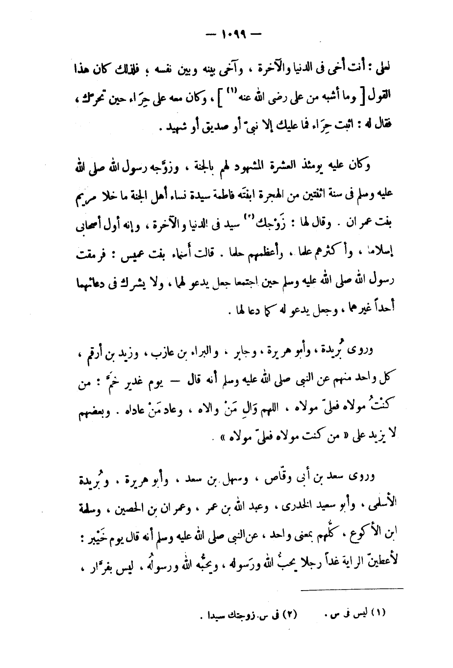 لعلي: أنت أخي فِي الدنيا والآخرة، وآخى بينه وبين نفسه، فلذلك كَانَ هَذَا القول [وما أشبه من علي رَضِيَ اللَّهُ عَنْهُ [١]] ، وَكَانَ معه على حراء حين تحرك، فَقَالَ لَهُ: أثبت حراء فما عليك إلا نبي أو صديق أو شهيد. وكان عَلَيْهِ يومئذ العشرة المشهود لهم بالجنة، وزوجه رَسُول اللَّهِ صَلَّى اللَّهُ عَلَيْهِ وَسَلَّمَ فِي سنة اثنتين من الهجرة ابنته فاطمة سيدة نساء أهل الجنة مَا خلا مَرْيَم بِنْت عِمْرَان. وقال لَهَا: زوجك [٢] سيد فِي الدنيا والآخرة، وإنه أول أصحابي إسلاما، وأكثرهم علما، وأعظمهم حلما. قالت أَسْمَاء بِنْت عميس: فرمقت رَسُول اللَّهِ صَلَّى اللَّهُ عَلَيْهِ وَسَلَّمَ حين اجتمعا جعل يدعو لهما، ولا يشرك فِي دعائهما أحدا غيرهما، وجعل يدعو لَهُ كما دعا لَهَا. وَرَوَى بُرَيْدَةَ، وَأَبُو هُرَيْرَةَ، وَجَابِرٌ، وَالْبَرَاءُ بْنُ عَازِبٍ، وَزَيْدُ بْنُ أَرْقَمَ، كُلُّ وَاحِدٍ مِنْهُمْ عن النبي صلى الله عليه وسلم أنه قَالَ- يَوْمَ غَدِيرِ خُمٍّ: مَنْ كُنْتُ مَوْلاهُ فَعَلِيٌّ مَوْلاهُ، اللَّهمّ وَالِ مَنْ وَالاهُ، وَعَادِ مَنْ عَادَاهُ. وبعضهم لا يَزِيد على «من كنت مولاه فعلي مولاه» . وَرَوَى سَعْدُ بْنُ أَبِي وَقَّاصٍ، وَسَهْلُ بْنُ سَعْدٍ، وَأَبُو هُرَيْرَةَ، وَبُرَيْدَةُ الأَسْلَمِيُّ، وَأَبُو سَعِيدٍ الْخُدْرِيُّ، وَعَبْدُ اللَّهِ بن عمر، وعمران بن الحصين، وسلمة ابن الأَكْوَعِ، كُلُّهُمْ بِمَعْنًى وَاحِدٍ، عَنِ النَّبِيِّ صَلَّى اللَّهُ عَلَيْهِ وَسَلَّمَ أَنَّهُ قَالَ يَوْمَ خَيْبَرَ: لأُعْطِيَنَّ الرَّايَةَ غَدًا رَجُلا يُحِبُّ اللَّهَ وَرَسُولَهُ، ويحبّه الله ورسوله، ليس بفرّار،