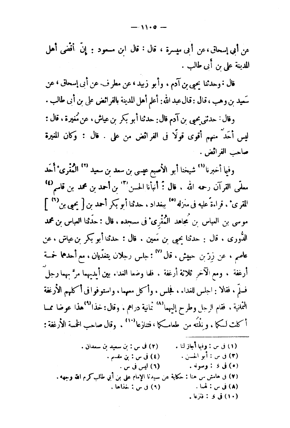 وفيما أَخْبَرَنَا [١] شيخنا أَبُو الأصبع عِيسَى بْن سَعْد بْن سَعِيد [٢] المقرئ أحد معلّمى القرآن رحمه الله، قَالَ: أَنْبَأَنَا الْحَسَن [٣] بْن أَحْمَد بْن مُحَمَّد بْن قَاسِم [٤] المقرئ، قراءةً عَلَيْهِ فِي منزله [٥] ببغداد، حَدَّثَنَا أَبُو بَكْر أَحْمَد بْن [يَحْيَى بن [٦]] موسى بن العباس بن مجاهد المقري فِي مسجده، قَالَ: حَدَّثَنَا الْعَبَّاس بْن مُحَمَّد الدوري، قَالَ: حَدَّثَنَا يَحْيَى بْن معين، قَالَ: حدثنا أبو بكر بن عياش، عن عاصم، عن زرّ بن حبيش، قال [٧] : جاس رجلان يتغديان، مع أحدهما خمسة أرغفة، ومع الآخر ثلاثة أرغفة، فلما وضعا الغداء بين أيديهما مر بهما رجل فسلم، فقالا: اجلس للغداء، فجلس، وأكل معهما، واستوفوا فِي أكلهم الأرغفة الثمانية، فقام الرجل وطرح إليهما [٨] ثمانية دراهم، وَقَالَ: خذا [٩] هَذَا عوضا مما أكلت لكما ونلته من طعامكما، فتنازعا [١٠] ، وَقَالَ صاحب الخمسة الأرغفة: